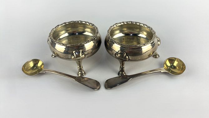 A pair of George III silver cauldron salts, by Robert Hennel I & Samuel Hennel, London, 1806, leaf capped hoof pad feet, diameter 7.2cm, together with a pair of Georgian condiment/ sauce spoons, lacking town mark, maker T.B., with gilt bowls, gross total weight 6.6oz (4)