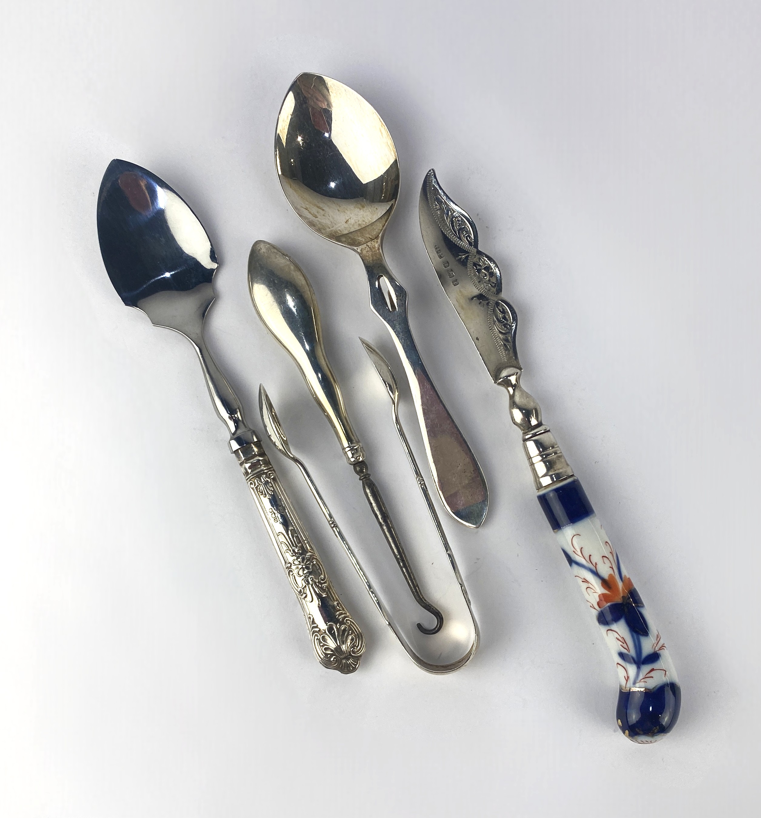 A pair of late Victorian silver sugar tongs, Sheffield, 1894, together with a silver spoon, a silver handled button hook, a silver handled spoon and a silver bladed knife with ceramic handle (5)