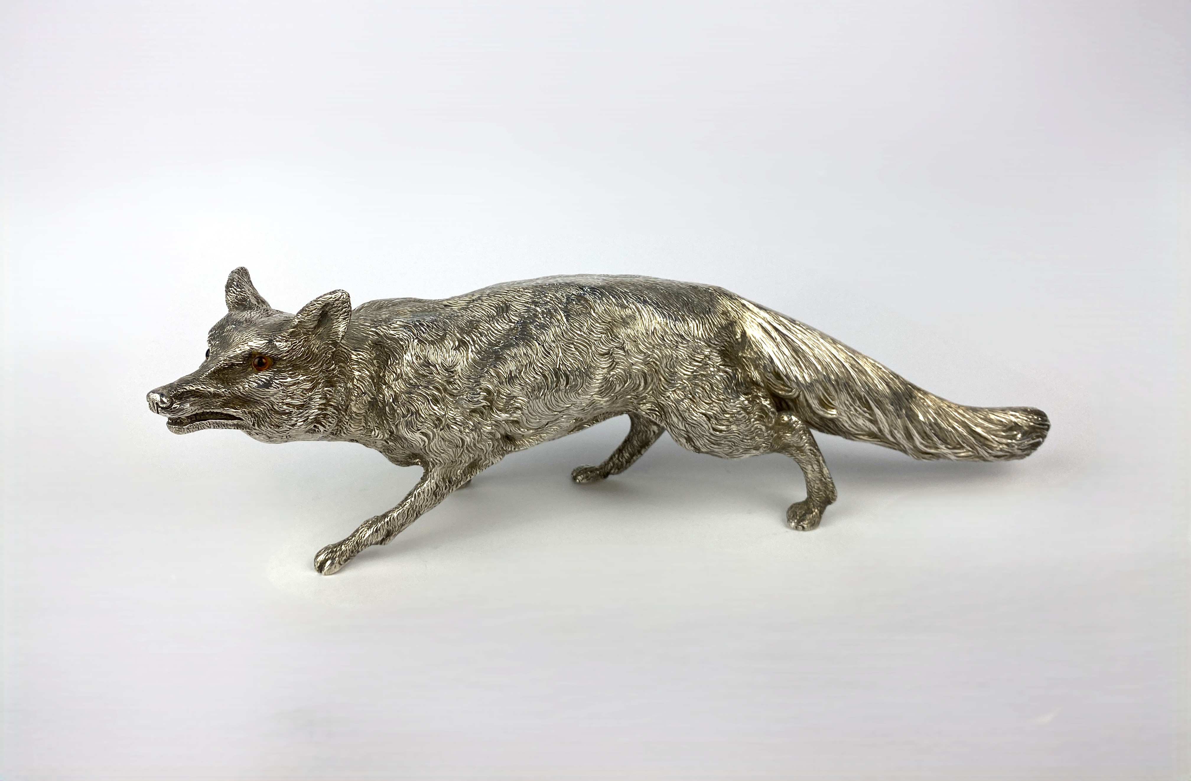 An Elizabeth II silver model of a stalking fox, by C.J. Vander Ltd., London, 1979, realistically cast with snarling mouth, having amber glass eyes, height 10.5cm, length 33cm, 38.5oz