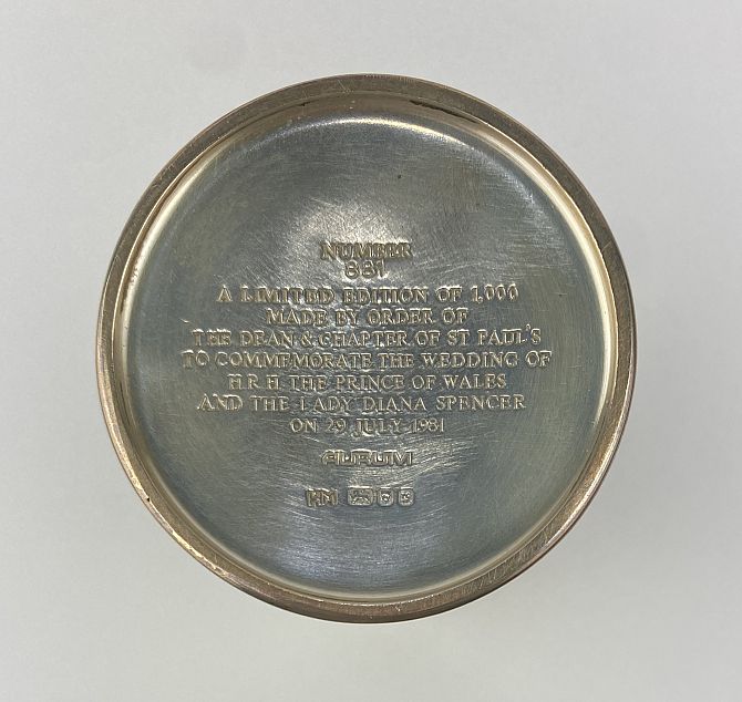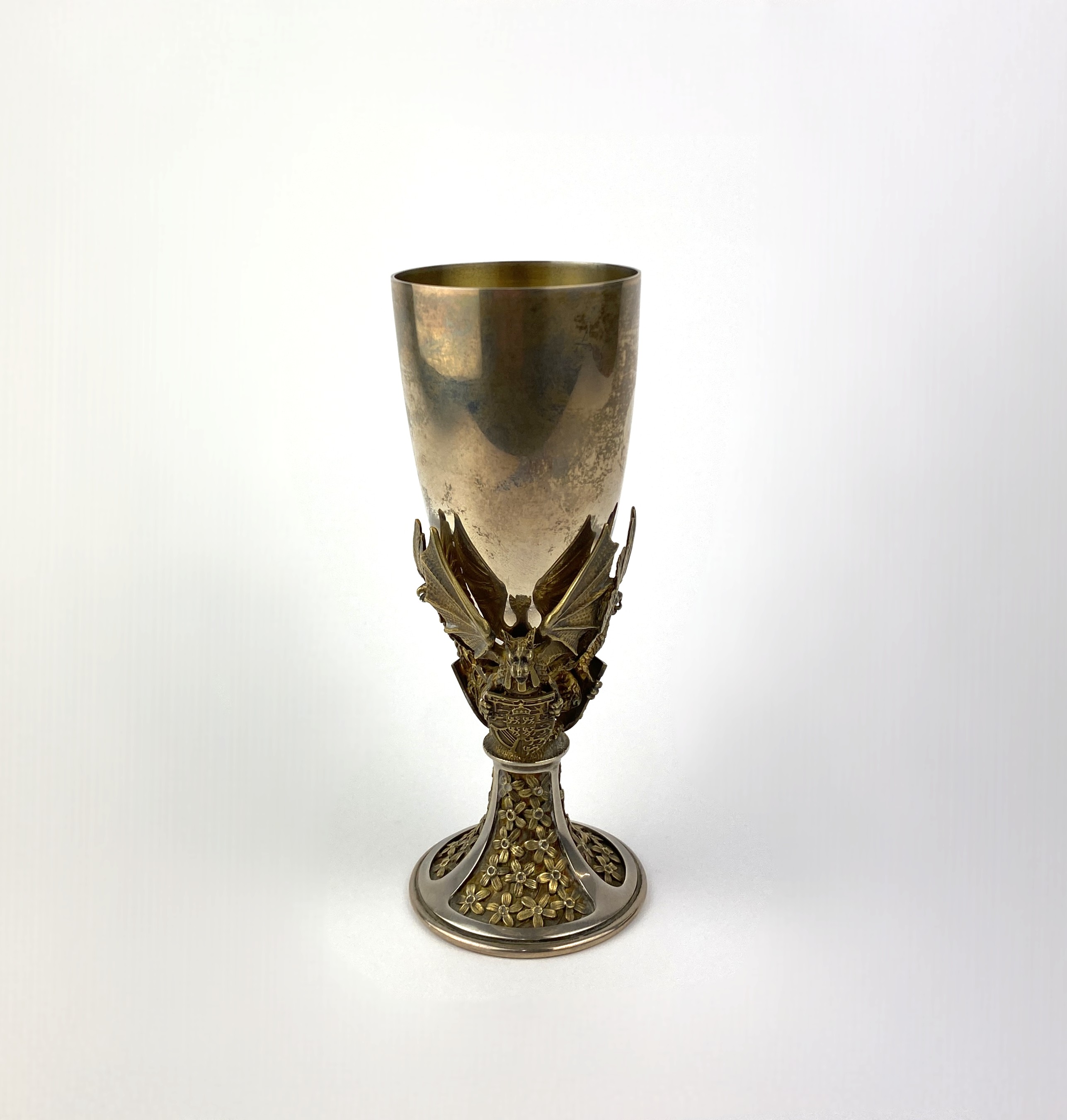 An Elizabeth II silver and silver gilt limited edition Royal Wedding commemorative goblet, by Hector Miller for Aurum, London, 1981, plain bowl, stem modelled as four winged griffins/ dragons holding heraldic shields, the foot cast with repeating flowers, marked to base 'Made by Order of the Dean & Chapter of St Paul's', numbered 881, from an edition of 1000, height 17cm, 12oz