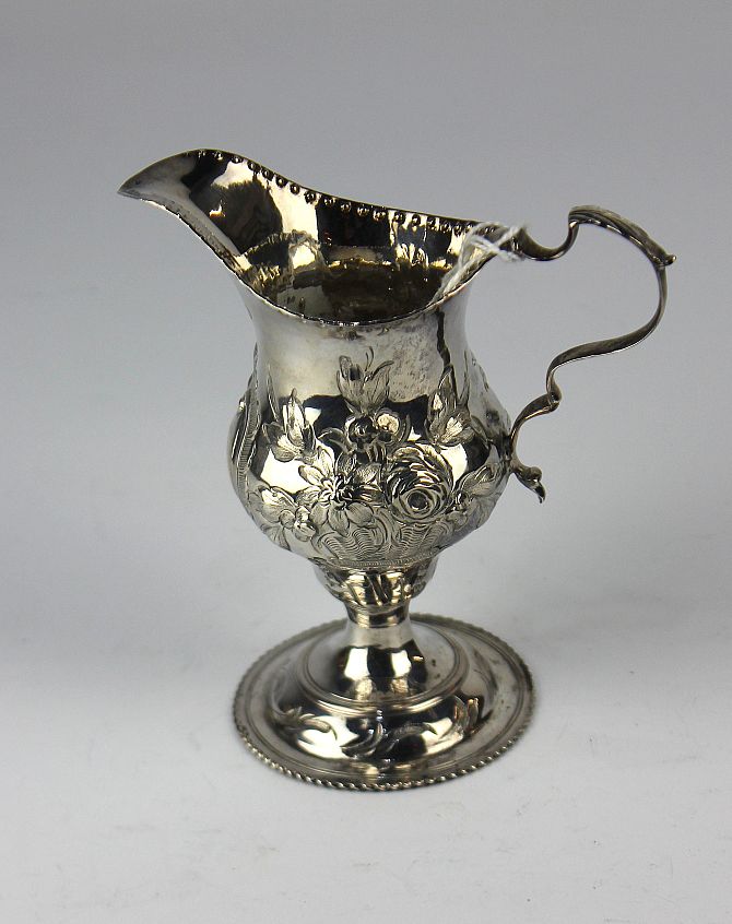 A George III silver cream jug, possibly by James Jennings (makers mark II), London, 1786, with beaded rim and foot, with scroll shaped handle, embosse decorated with baskets of flower, monogram engraved to cartouchd, height 11.5cm, 2.5oz