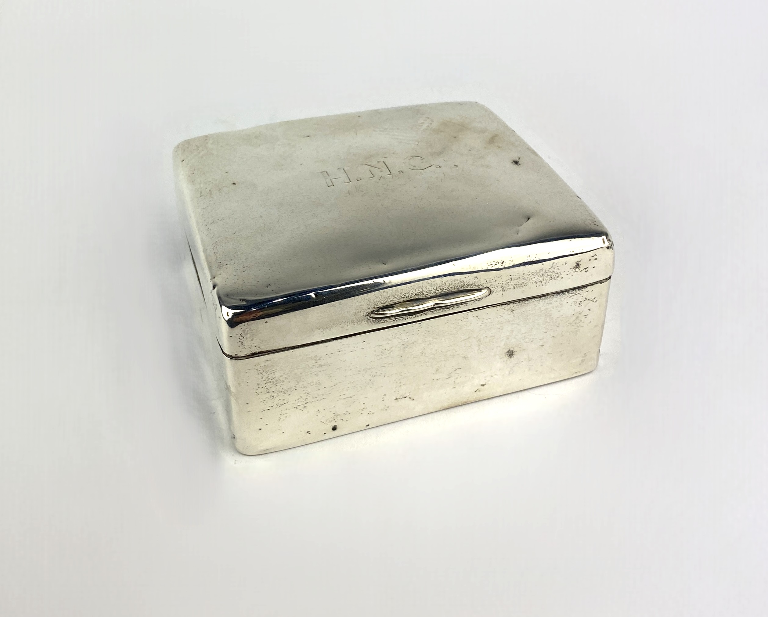 An Art Deco style silver cigarette box, marks rubbed, monogram engraved to hinged lid 'H.N.C', cedar lined, width 9.6cm (AF)