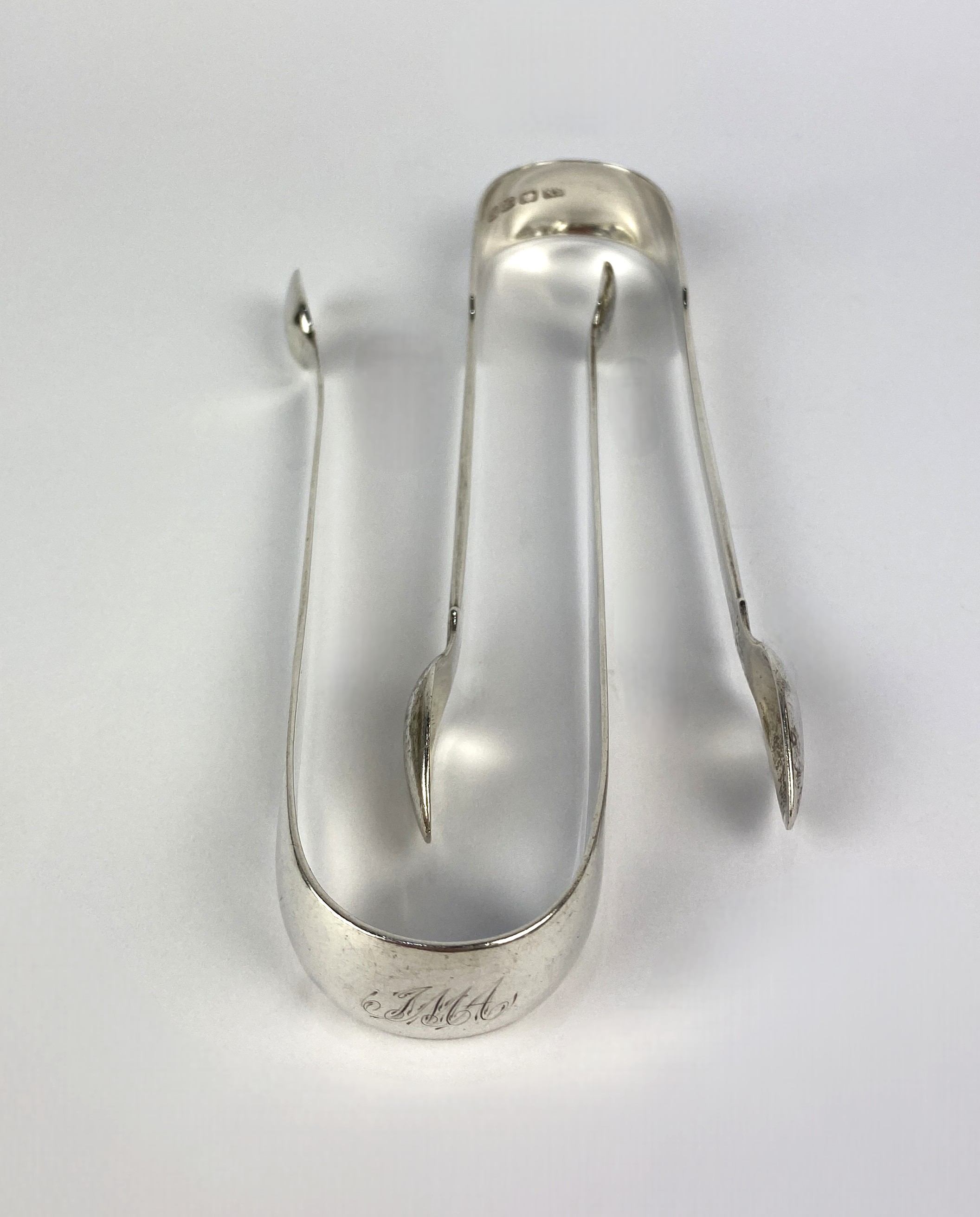 A pair of George III Irish silver sugar tongs, by Samuel Neville, Dublin, lacking date letter, engraved horses head crest and monogrammed 'T.F'., length 14.5cm, together with a further pair of Georgian Irish sugar tongs, marks rubbed, monogram engraved, length 14.5cm, gross total weight 2.6oz (2)