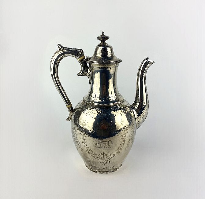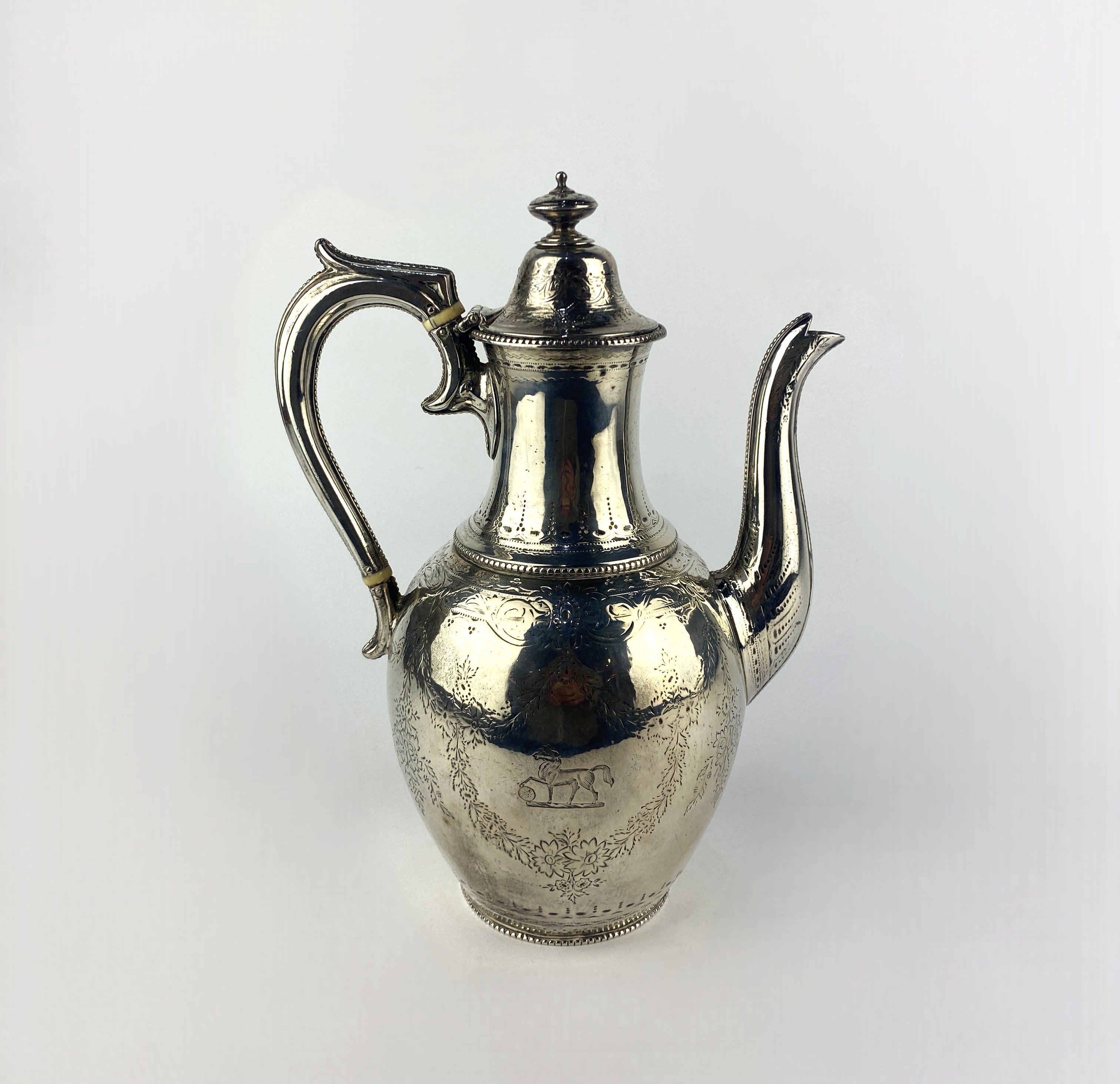 A Victorian silver coffee pot, by Robert Harper, London, 1871, of circular baluster form, engraved with floral swag decoration and emblem of a horse with hoof raised upon a sphere, with ivory insulators, height 26.5cm, gross total weight 23.7oz