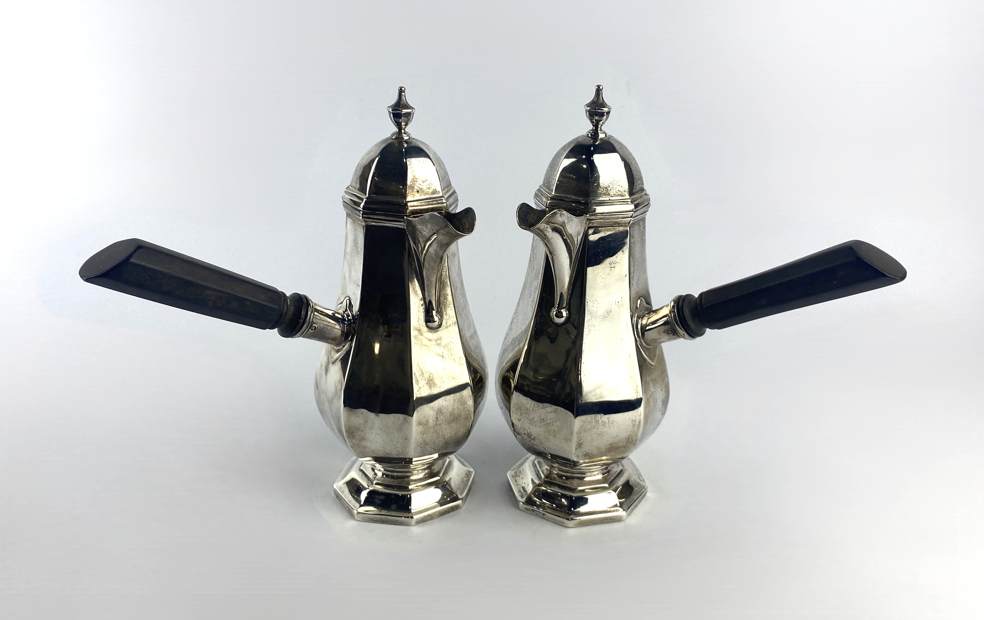 A pair of George V silver chocolate pots, by Goldsmiths & Silversmiths Company Ltd., Sheffield, 1920, of octagonal baluster form, with urn finial to hinged lid, with turned ebonised handle, height 19.5cm, gross total weight 19.9oz (AF)