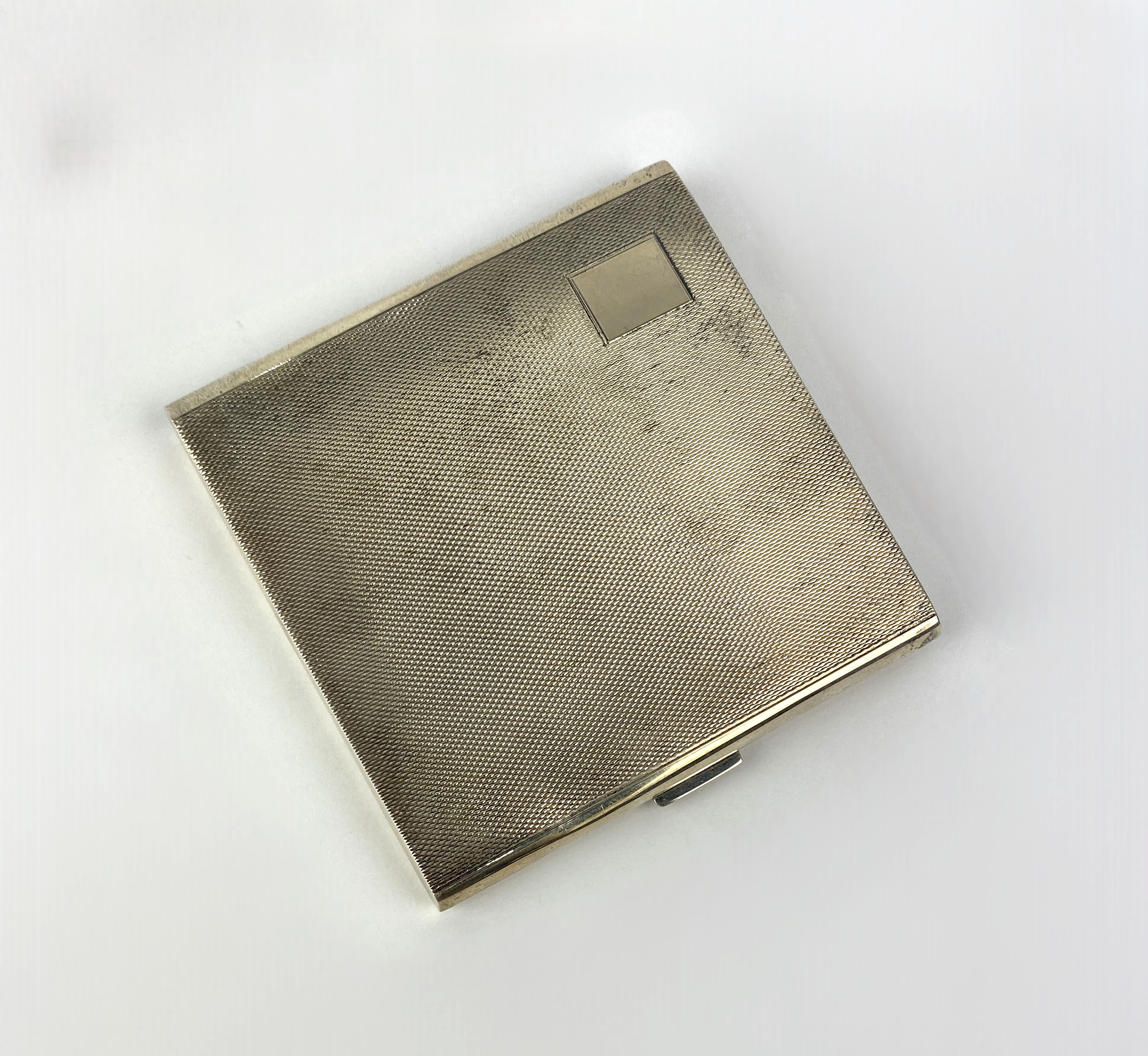 An Elizabeth II square engine turned cigarette case, by William Neale & Son Ltd., Birmingham, 1960, gilt wash interior, width 8.5cm, 4oz