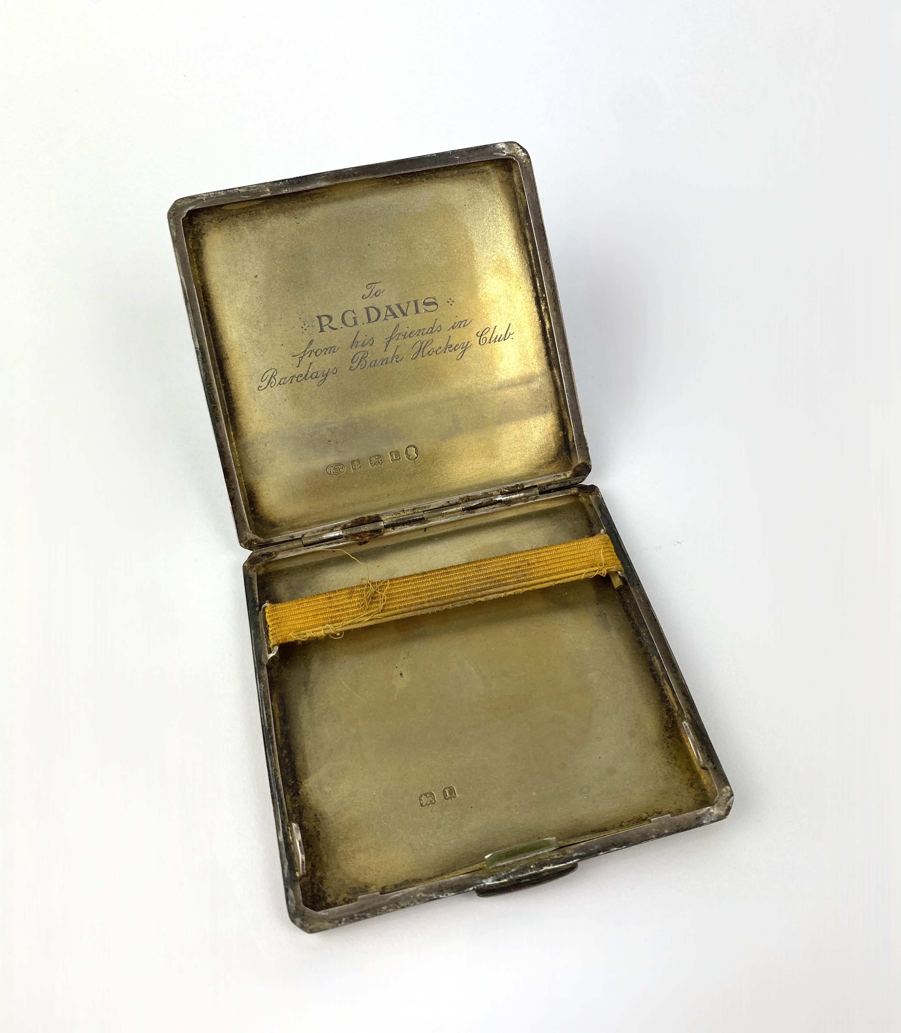 A George V silver square cigarette case, by Alexander Clark & Co. Ltd., Birmingham, 1935 (Jubilee hallmark), engine turned decoration, presentation engraved to gilt wash interior 'To R. G. Davis, from his friends in Barclays Bank Hockey Club', height 8.5cm, 3.6oz