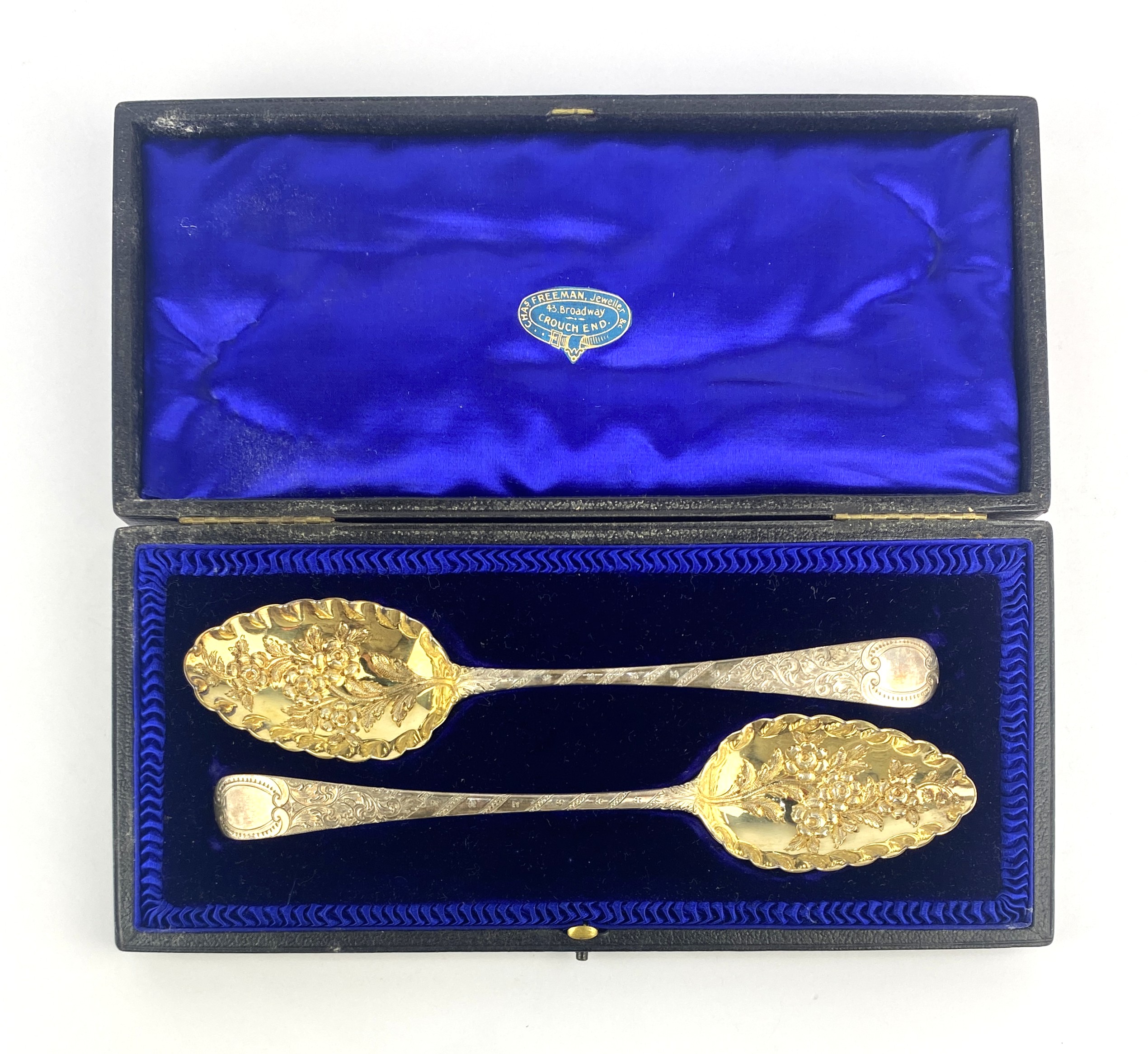 Two matched George III silver gilt berry fruit serving spoons, one by William Ely I & William Fearn, London 1800, 1801, having floral decoration to the gilt bowls, within Chas. Freeman Crouch End retailers box, length 21.5cm, 3.7oz (2)
