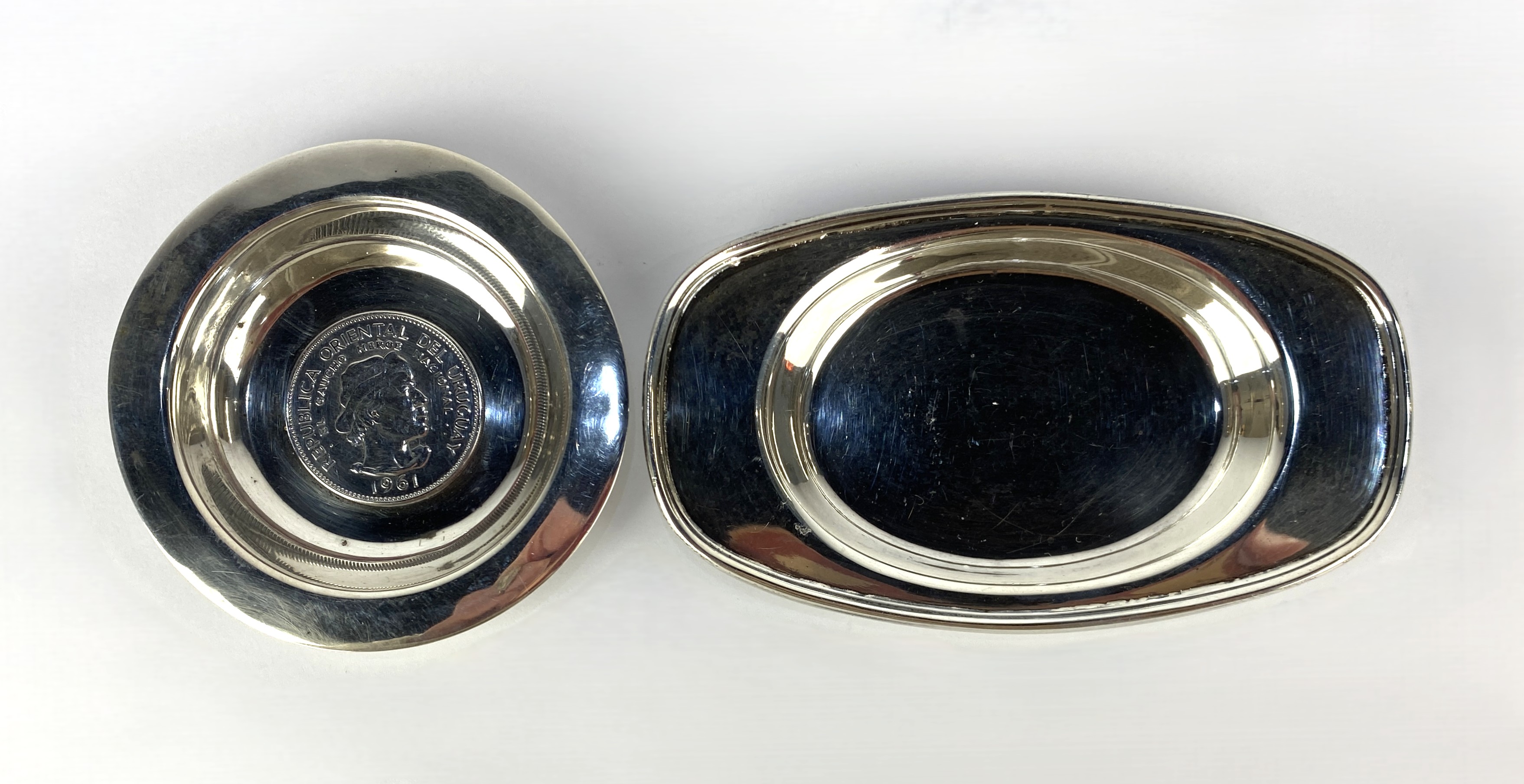 An Elizabeth II Walker & Hall silver pin tray, Sheffield, 1960, width 12.5cm, together with a white metal coin dish, marked 900, inset with a Uruguay 10 Pesos, diameter 8.2cm, gross total weight 3.9oz (2)