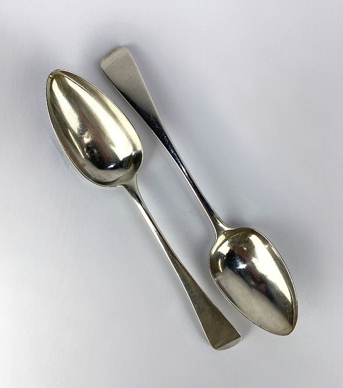 A pair of George III silver Old English pattern tablespoons, makers mark S.H., London, 1806, length 22cm, 3.8oz (2)