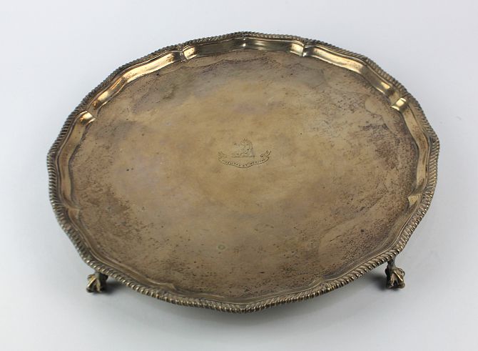 An Edwardian silver salver, by Goldsmiths & Silversmiths Company Ltd., London, 1909, with gadrooned rim, raised on four ball and claw feet, centrally engraved with a horses head crest holding a flower within mouth and the motto 'Fidelitas et Veritas', diameter 30.7cm, 27.8oz
