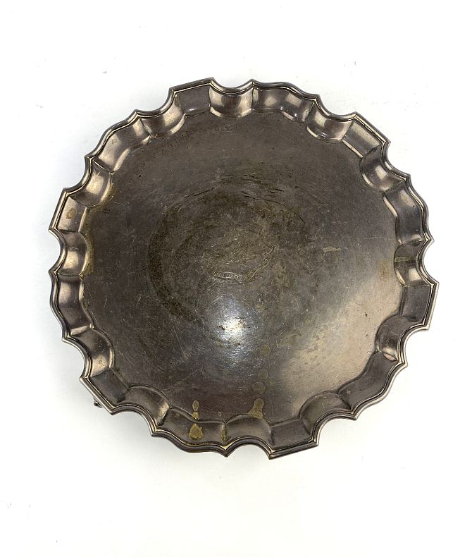 A George V silver circular card tray with pie crust border on three hoofed feet,...