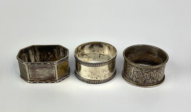 A George VI silver napkin ring, by Francis Howard Ltd., Sheffield, 1962, in card box; an octagonal silver Mappin & Webb napkin ring, town and date marks worn, engine turned decoration and engrave with initials, and a further silver napkin ring, marks rubbed, engraved scroll decoration (3)