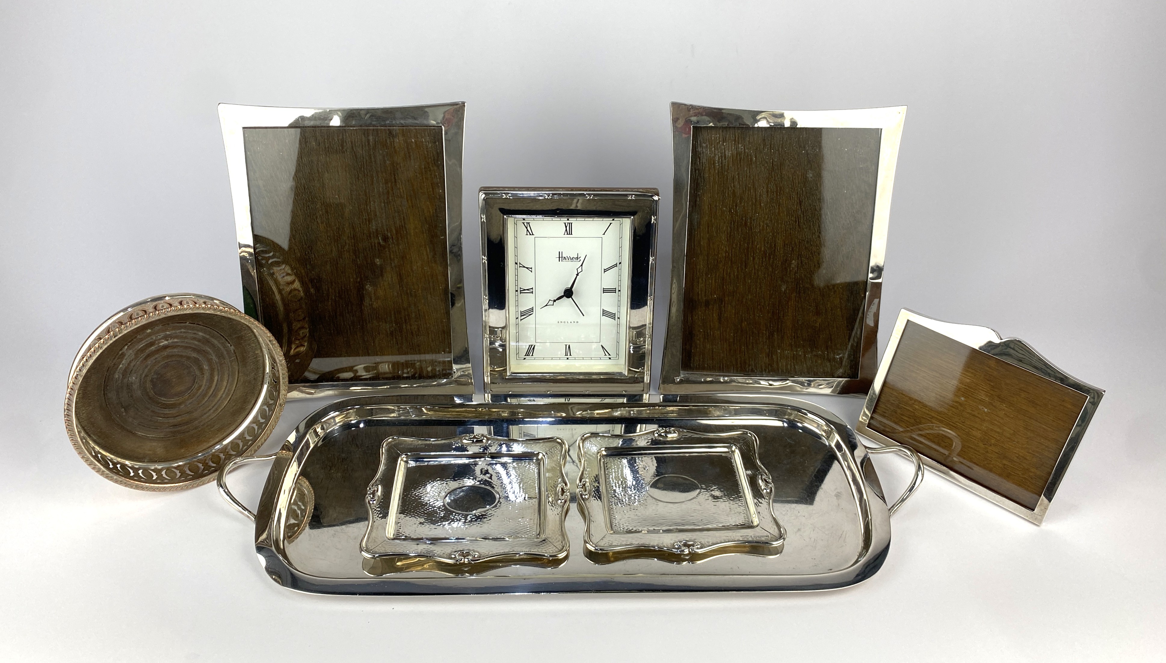 A pair of Edwardian silver photograph frames, by Henry Wilson Ltd., Birmingham, 1902, with oak easel back, height 22.7cm; together with a George V silver photograph frame by E. S. Barnsley Co., Birmingham, 1921, width 13.8cm; a pair of Art Nouveau silver card trays, marks worn, Rd. No. 500200, width 13.7cm; a Mappin & Webb silver plated two handled tray, width 47.5cm; an Elizabeth II Harrods silver framed clock, Sheffield, 1995, height 16.7cm and a silver plated bottle coaster (8)