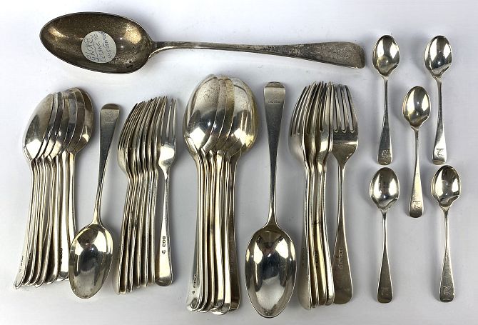 An Edwardian part canteen of silver flatware, by Wakely & Wheeler, London, 1909, Old English pattern, including; seven tablespoons, eight dessert spoons, five teaspoons, seven dessert forks, five table forks, and a large silver serving spoon, each with terminal engraved with a horses head holding flower within mouth, serving spoon length 30.25cm, total gross weight approx. 61.7oz (33 pieces)
