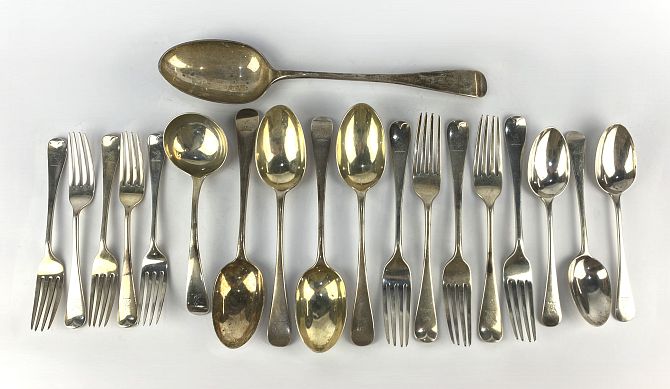 An Edwardian part canteen of silver flatware, by Wakely & Wheeler, London, 1905 - 1908, Old English pattern, including; serving spoon, four tablespoons, sauce ladle, three dessert spoons, five table forks, five dessert forks, each with terminal engraved with a horses head holding flower within mouth, serving spoon length 30cm, total gross weight approx. 42.4oz (19 pieces)
