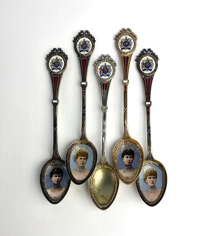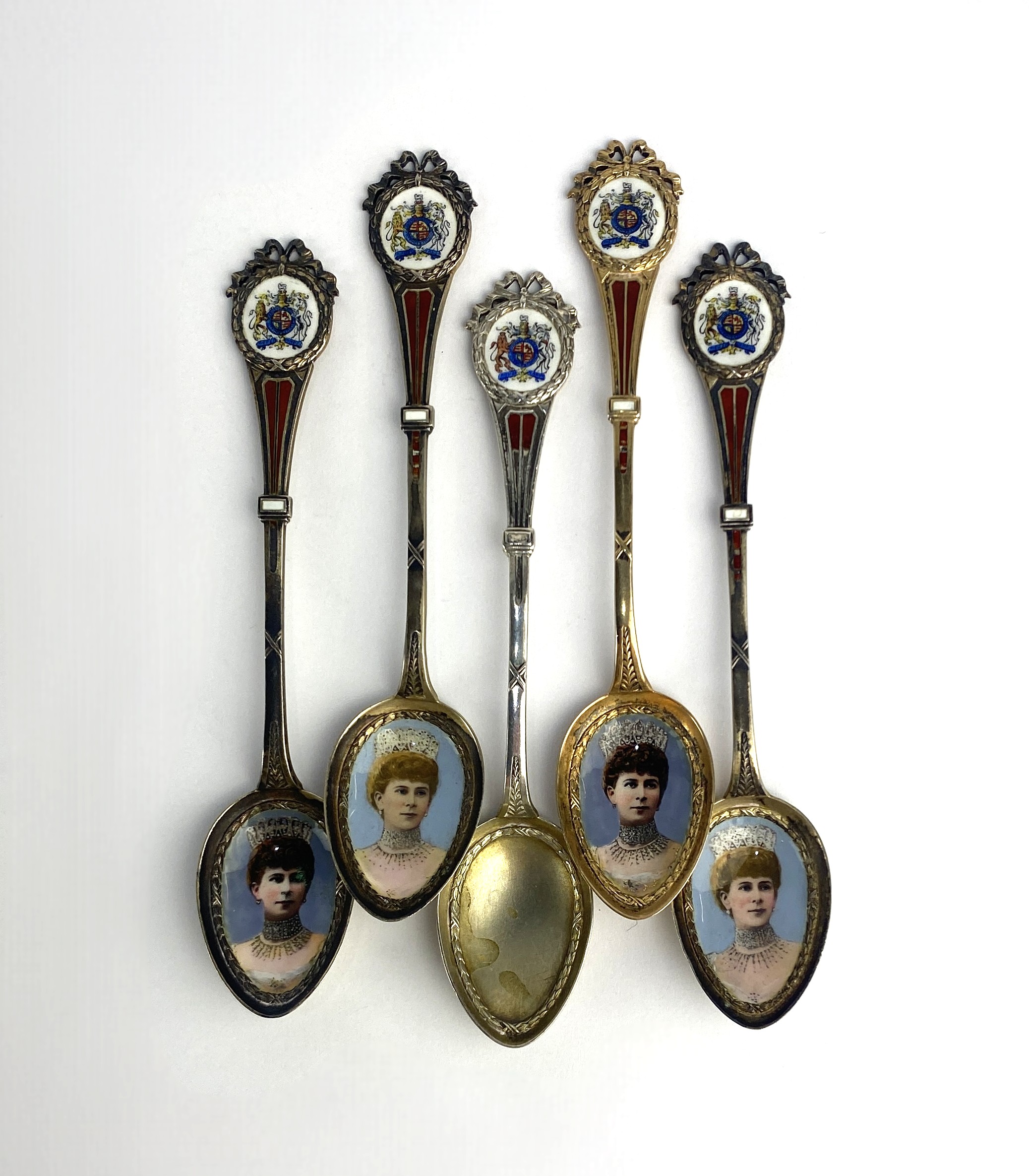 A set of five Queen Mary (Mary of Teck) silver gilt commemorative teaspoons, each bearing enamel portait to bowl (one lacking), terminals case as a bow, inset with Royal coat of arms, import marks, London, 1911, length 12.5cm, gross weight 2.8oz