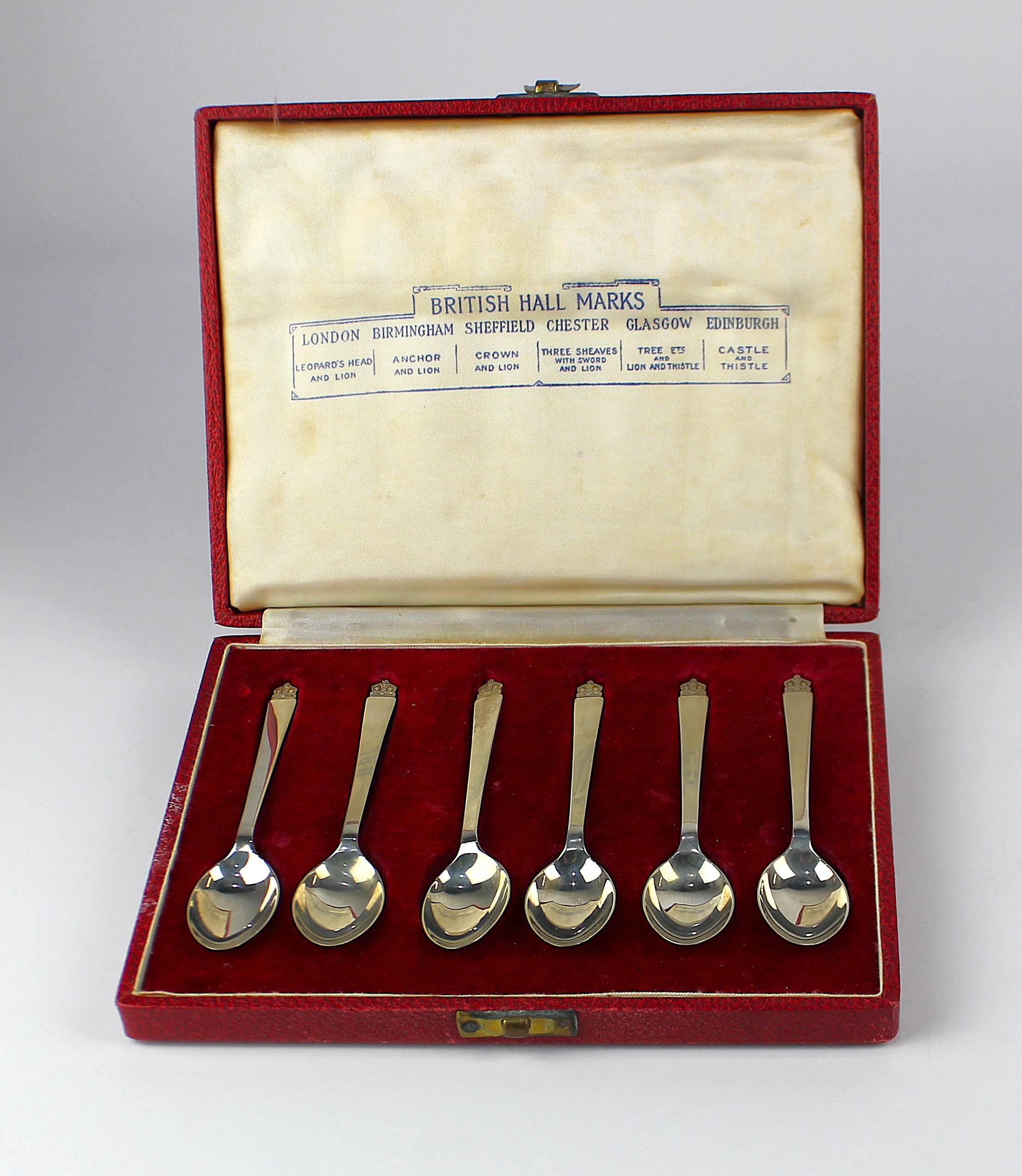 A set of Elizabeth II silver British hallmark spoons, by Roberts & Belk Ltd., 1953, each with crown terminal, gross total weight 2.6oz