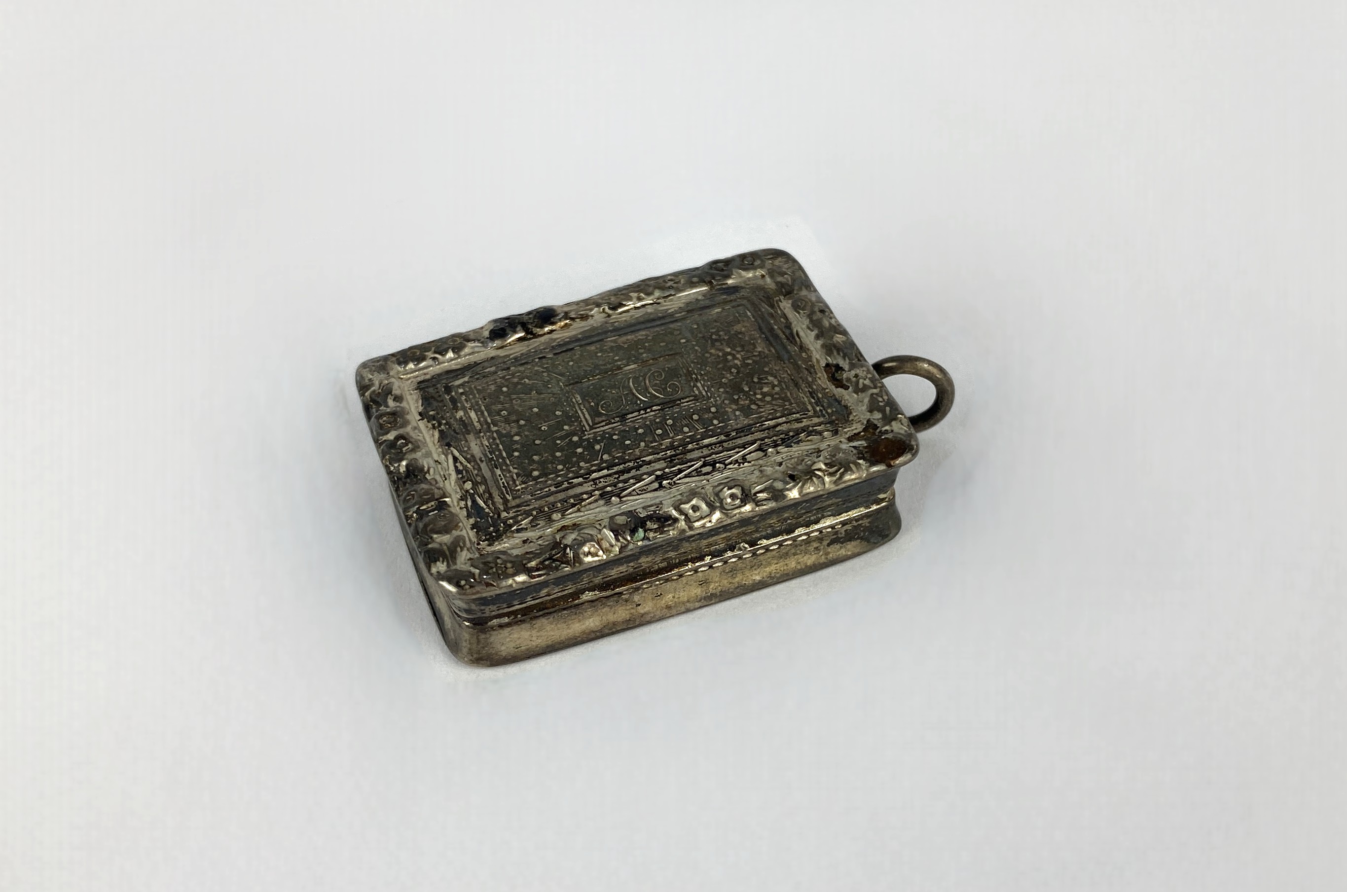 A silver vinaigrette by Nathaniel Mills, rectangular form with embossed and engraved decoration, gilt interior with hinged pierced inner cover, Birmingham 1843.