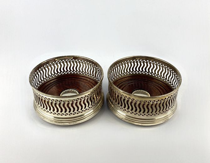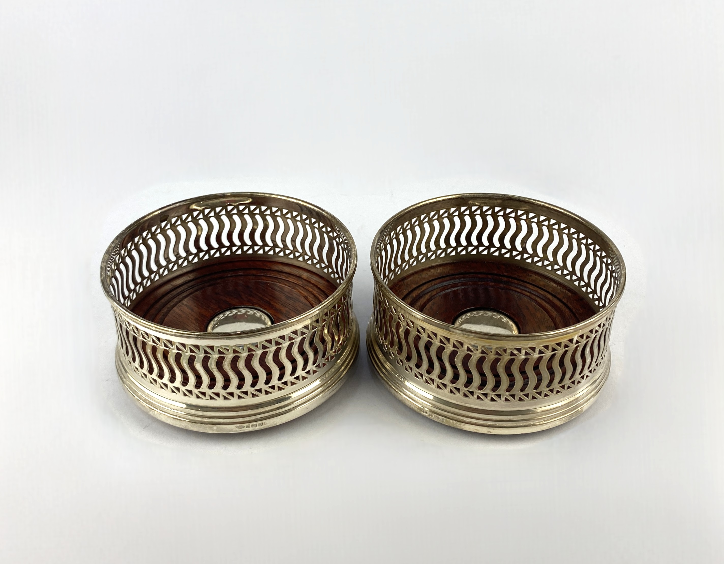 A pair of silver bottle coasters with turned wooden bases, W I Broadway & Co, Birmingham 1995, 9cm diameter.