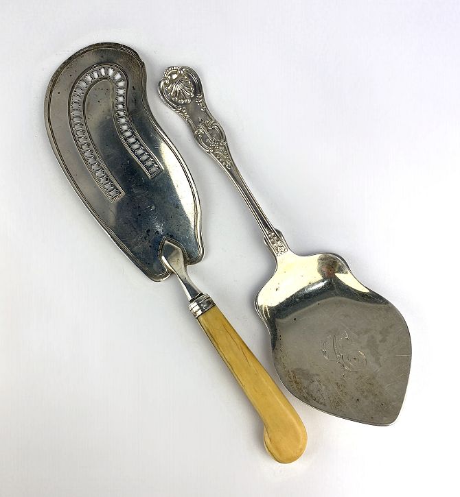 A George III silver fish slice with bone handle, maker's mark rubbed, London 1812, 28cm long, and an American Sterling silver cake slice, maker G W Russell, combined gross weight 7.3oz