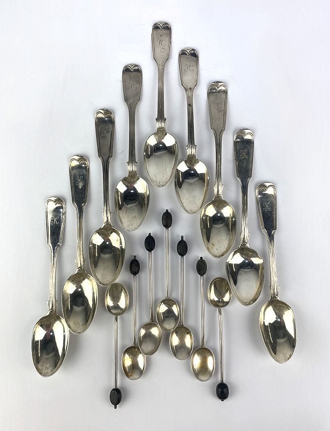 A French 84 silver Fiddle pattern tablespoon with engraved initial, a Chinese si...