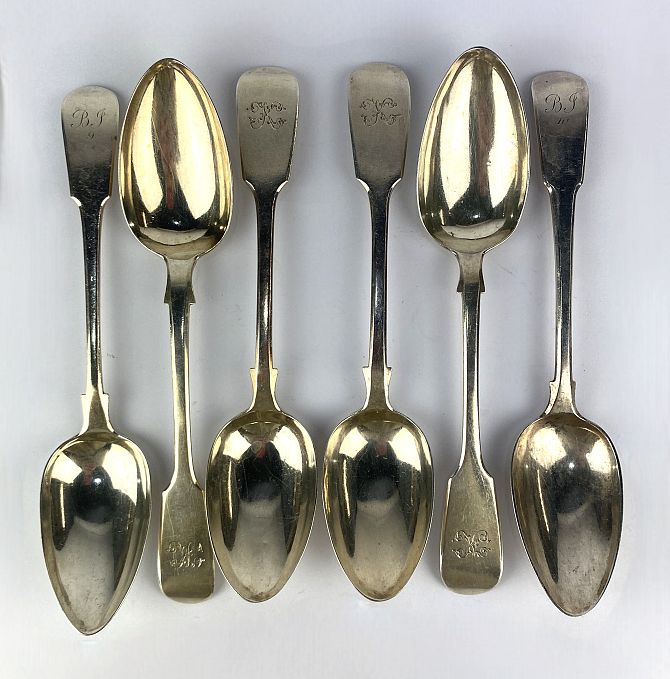 Six antique silver Fiddle pattern tablespoons to include one Edinburgh 1810 example, combined gross weight 14.4oz