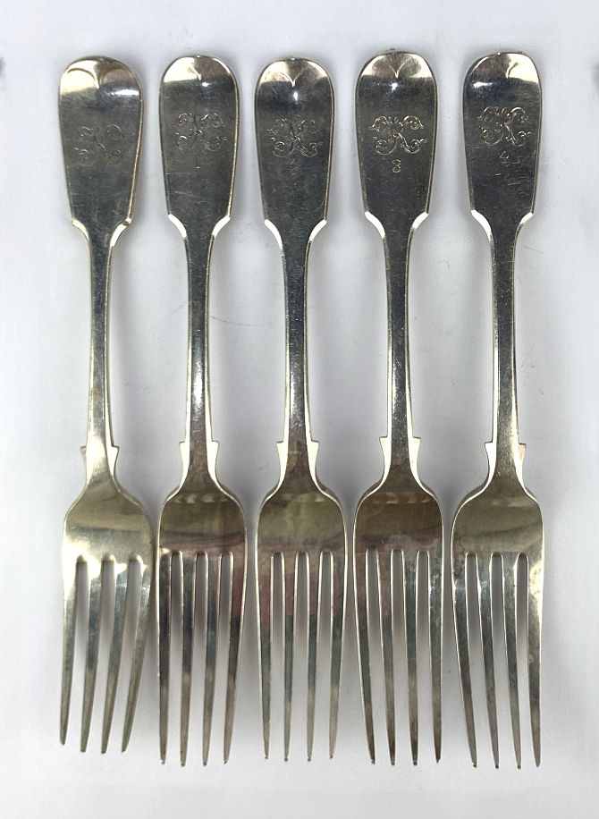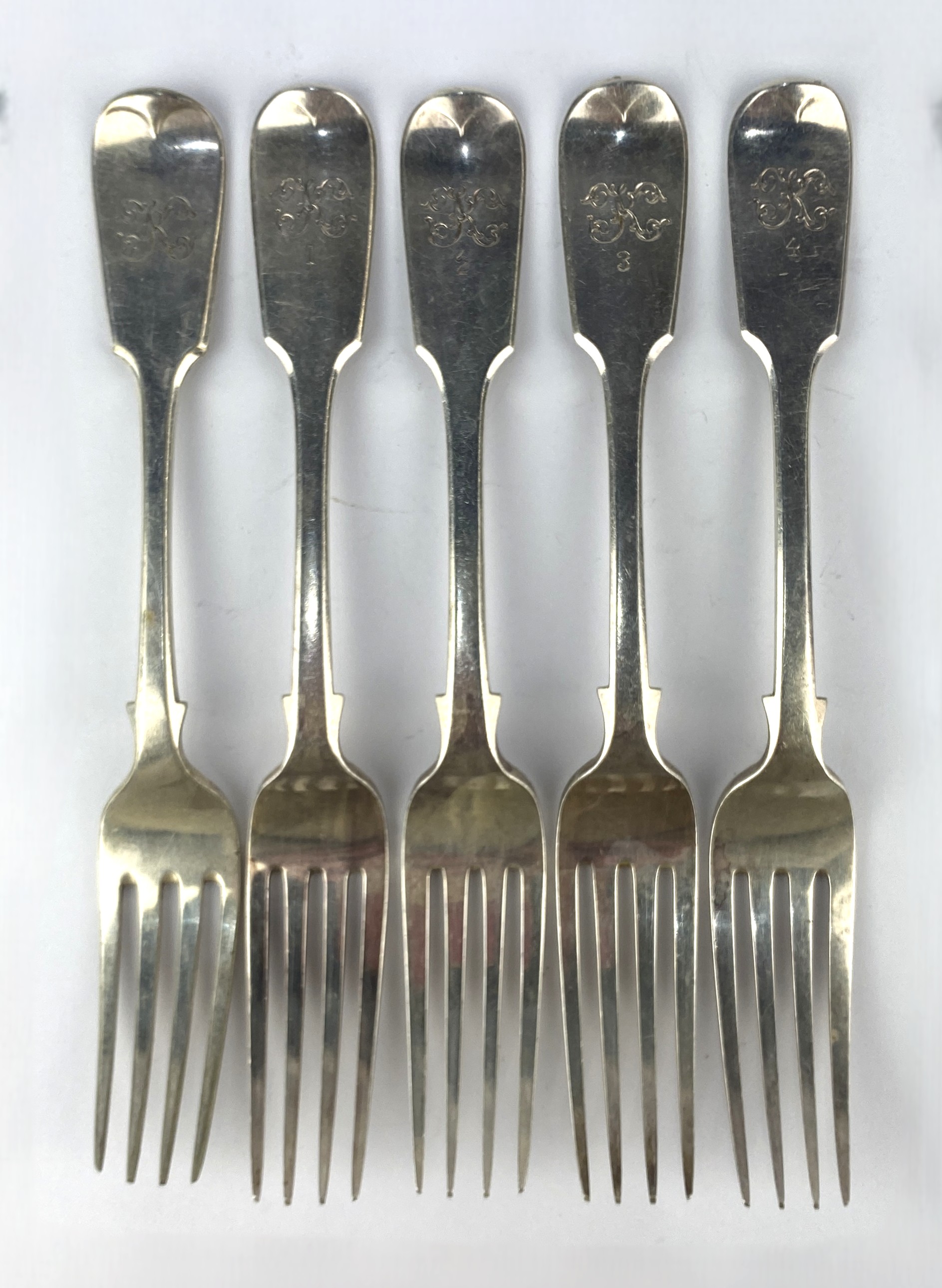 Five antique Fiddle pattern silver forks to include three London 1855, all monogram engraved, gross weight 13.1oz