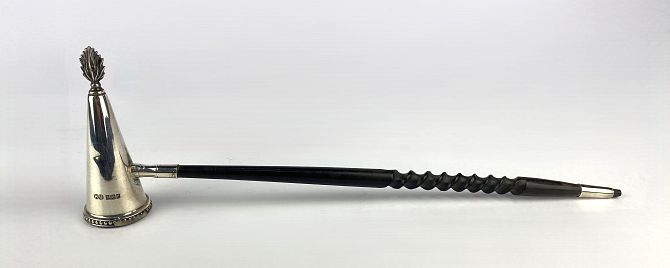 A silver candle snuffer, maker Hampton Utilities, Birmingham 1995, on turned wood handle, 26.5cm long