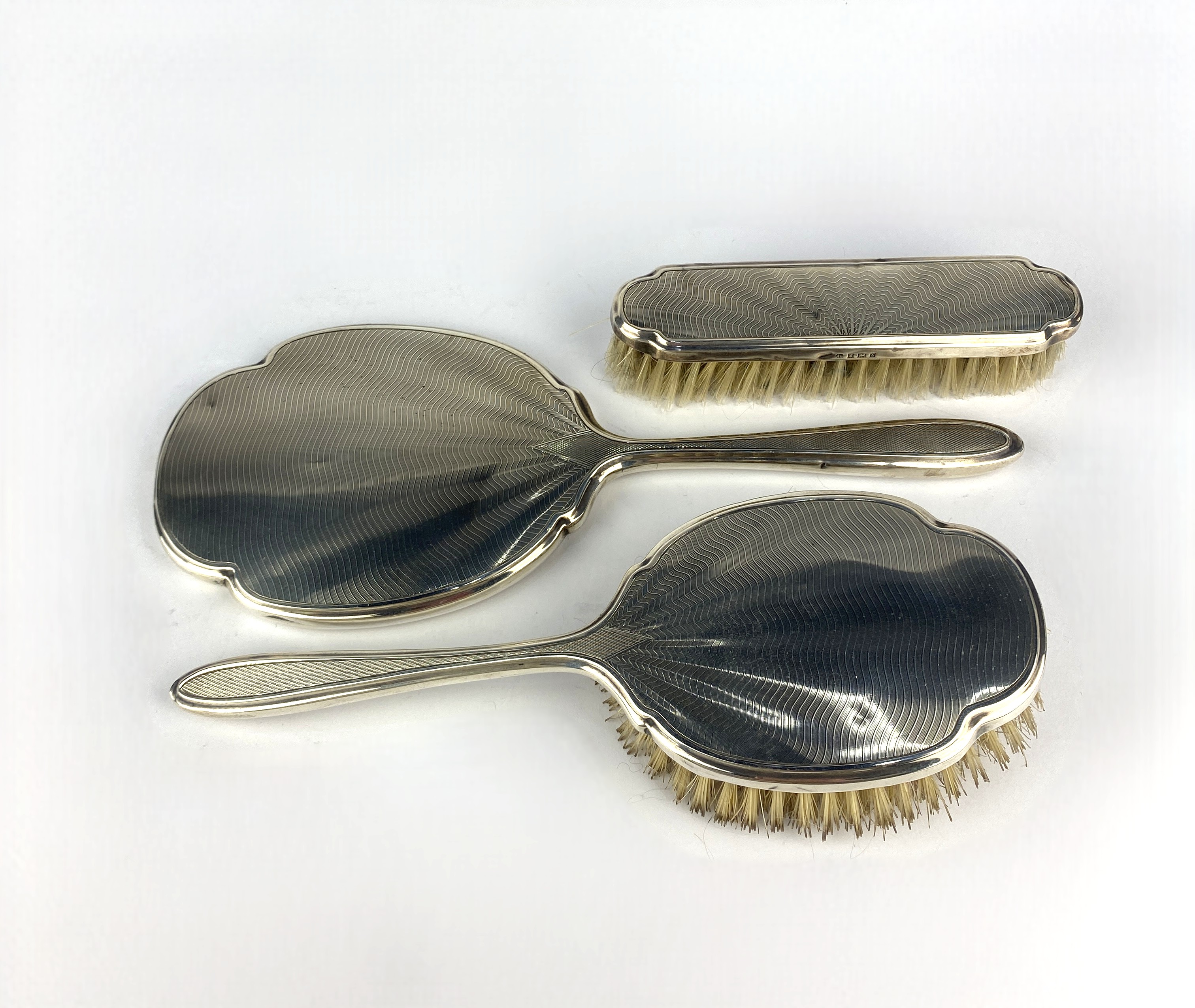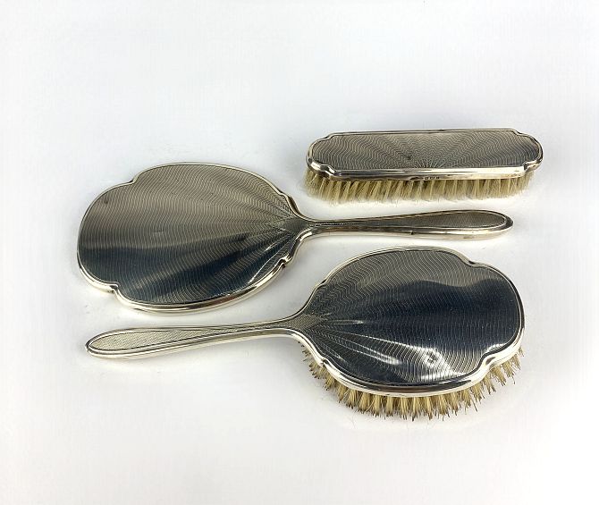 A silver three piece dressing table set, maker Albert Carter, Birmingham 1959, 1960, comprising a hand mirror and two brushes