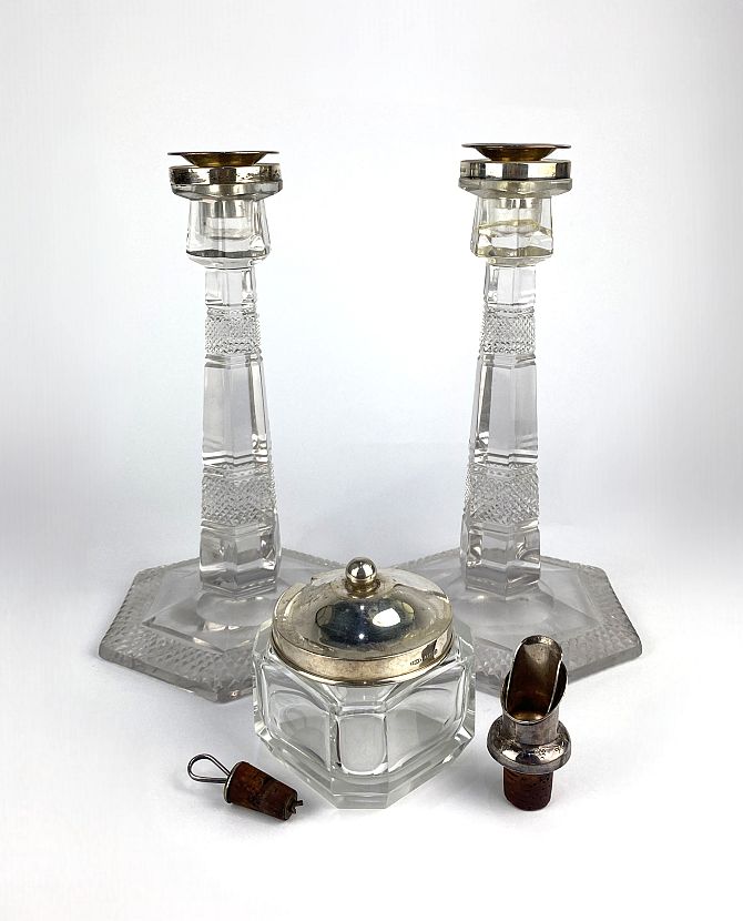 A pair of silver mounted cut glass candlesticks, with removable silver sconces, marks rubbed, probably Birmingham 1939, 24.5cm high, together with a silver lidded glass jar, and two other items