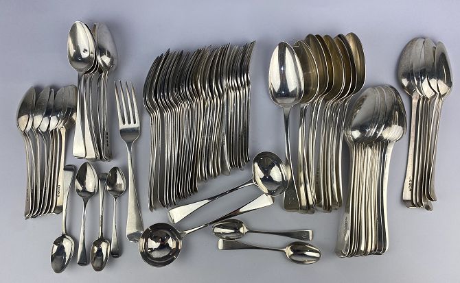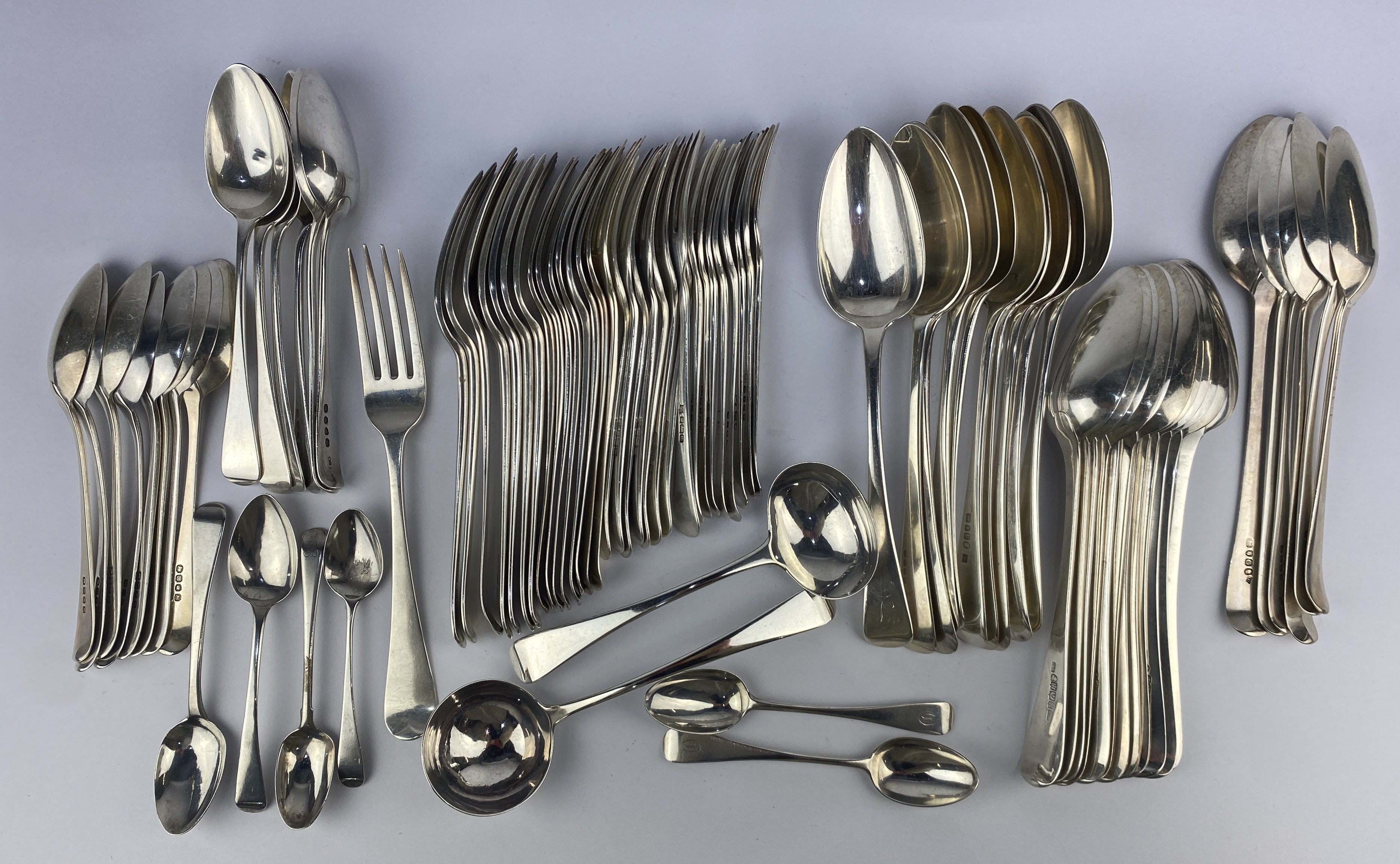A matched silver eighty-two piece canteen, various dates and makers, comprising thirty-two forks, twenty-eight tablespoons, fourteen dessert spoons, two sauce ladles, and six teaspoons, combined gross weight 126.3oz
