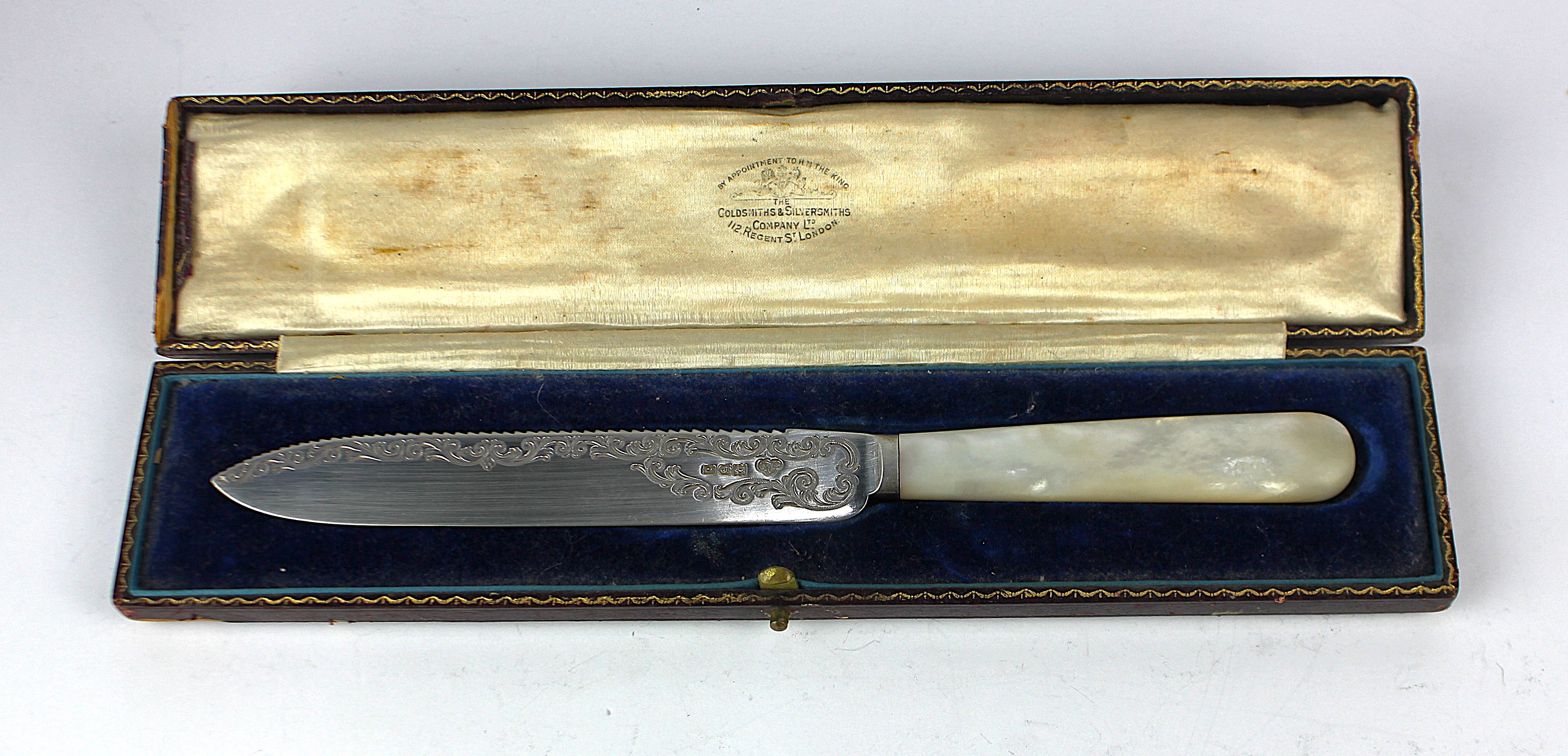 A George V silver bladed knife with mother of pearl handle, maker Goldsmiths & Silversmiths Co Ltd., London 1914, 24cm long, in fitted Goldsmiths & Silversmiths Company case