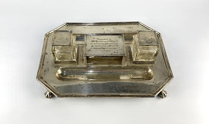 A George V silver desk stand by Horace Woodward & Co Ltd, the octagonal form fitted with two pen wells and a central receptical with hinged lid bearing a presentation inscription to the Reverend Horace Walpole, Hurstmonceaux, 1913, flanked by two glass inkwells with hinged silver lids, raised on four claw and ball feet, 28cm wide, London 1912, approximately 33 ozs of weighable silver plus the hinged inkwell lids