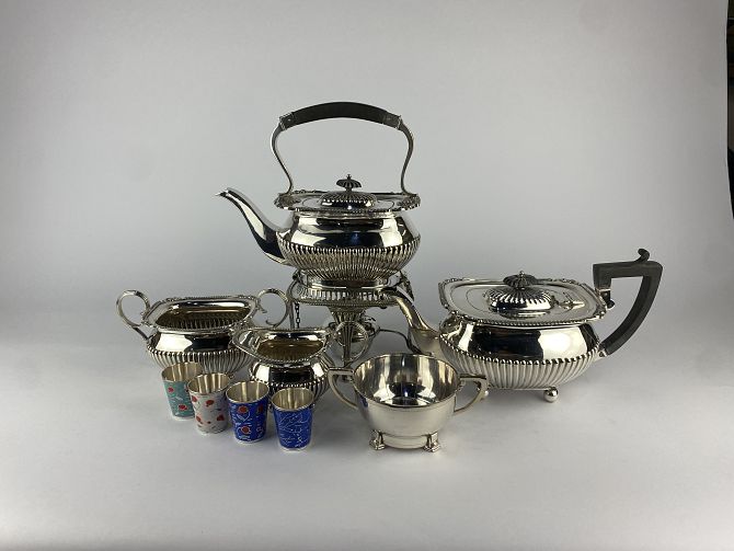 A silver plated four piece tea set comprising kettle on stand, teapot, sugar bowl and milk jug, together with a set of four enamelled shot cups, and an Art Deco style sugar bowl