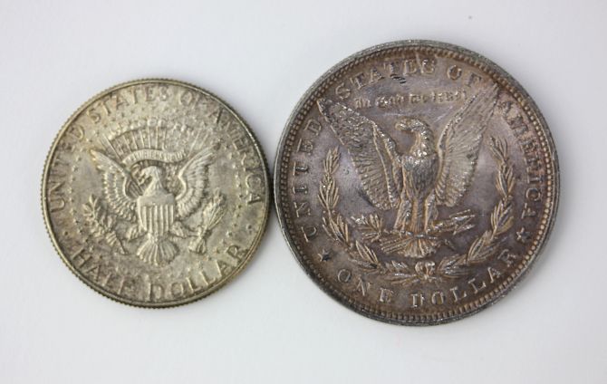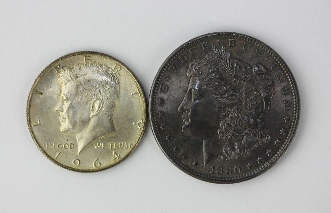 A USA morgan silver dollar 1880 and a President Kennedy half dollar 1964