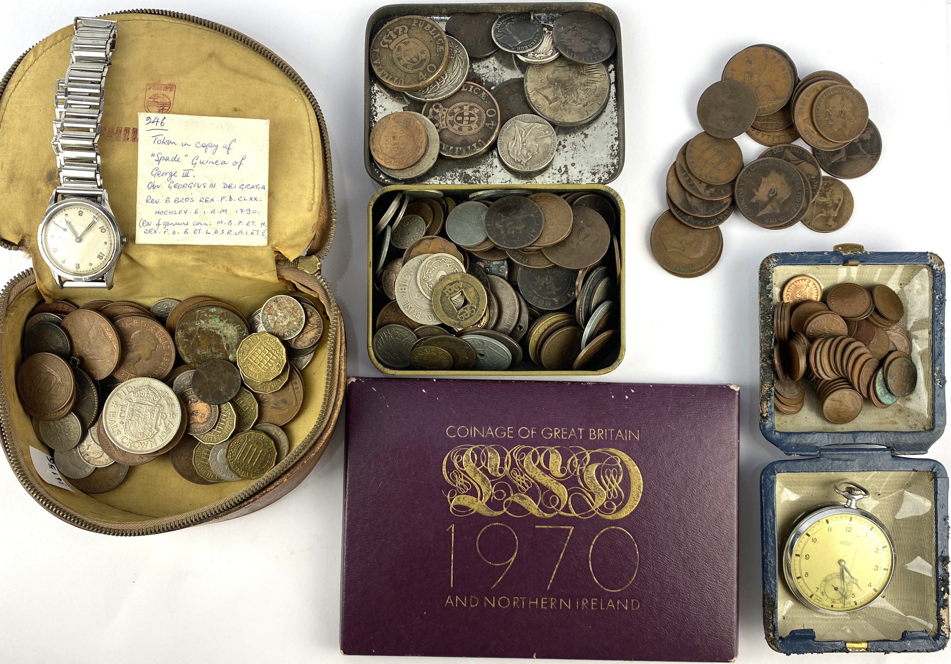 A quantity of British and foreign coins to include a USA silver dollar 1922, a Canada one cent 1916, a William and Mary half penny and Hong Kong five cents 1895. A pendant mounted medallion commemorating the Battle of Jutland and medallion commemorating the Dimond Jubilee of Queen Victoria, a 1970 proof coin set, a Arsa pocket watch and a gentlemen’s wrist watch