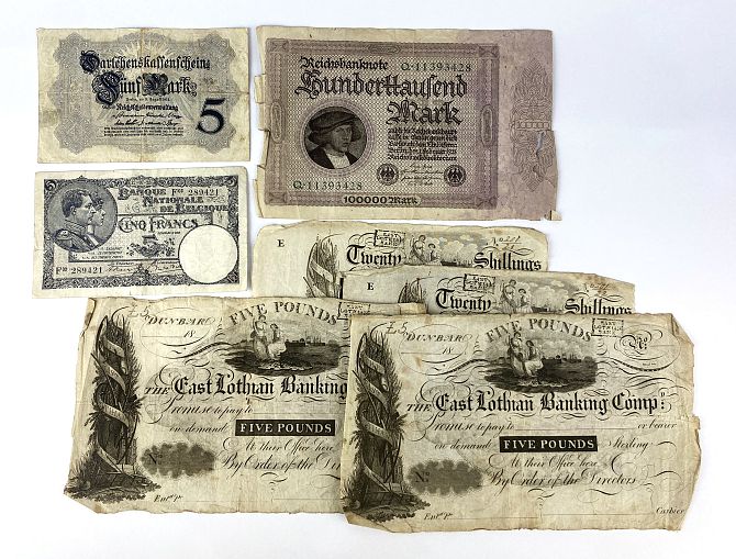 A collection of British and European bank notes to include four East Lothian Banking Company