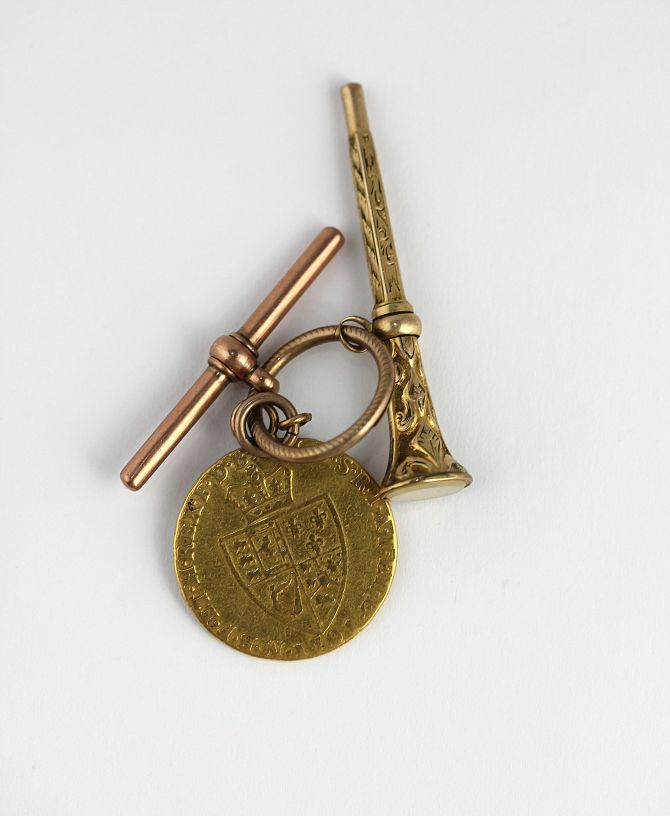 A George III spade guinea 1791 mounted as a pendant, with a 9ct gold T bar and a Victorian chalcedony seal ended watch key on a split ring