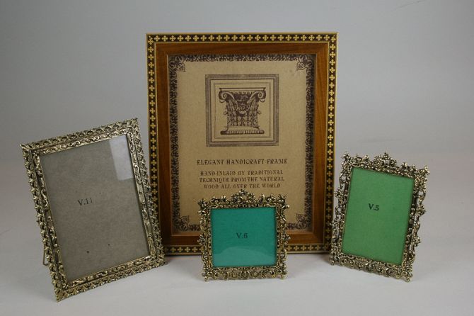 Five gilt metal photograph frames; three other frames and two clear glass ceiling light shades