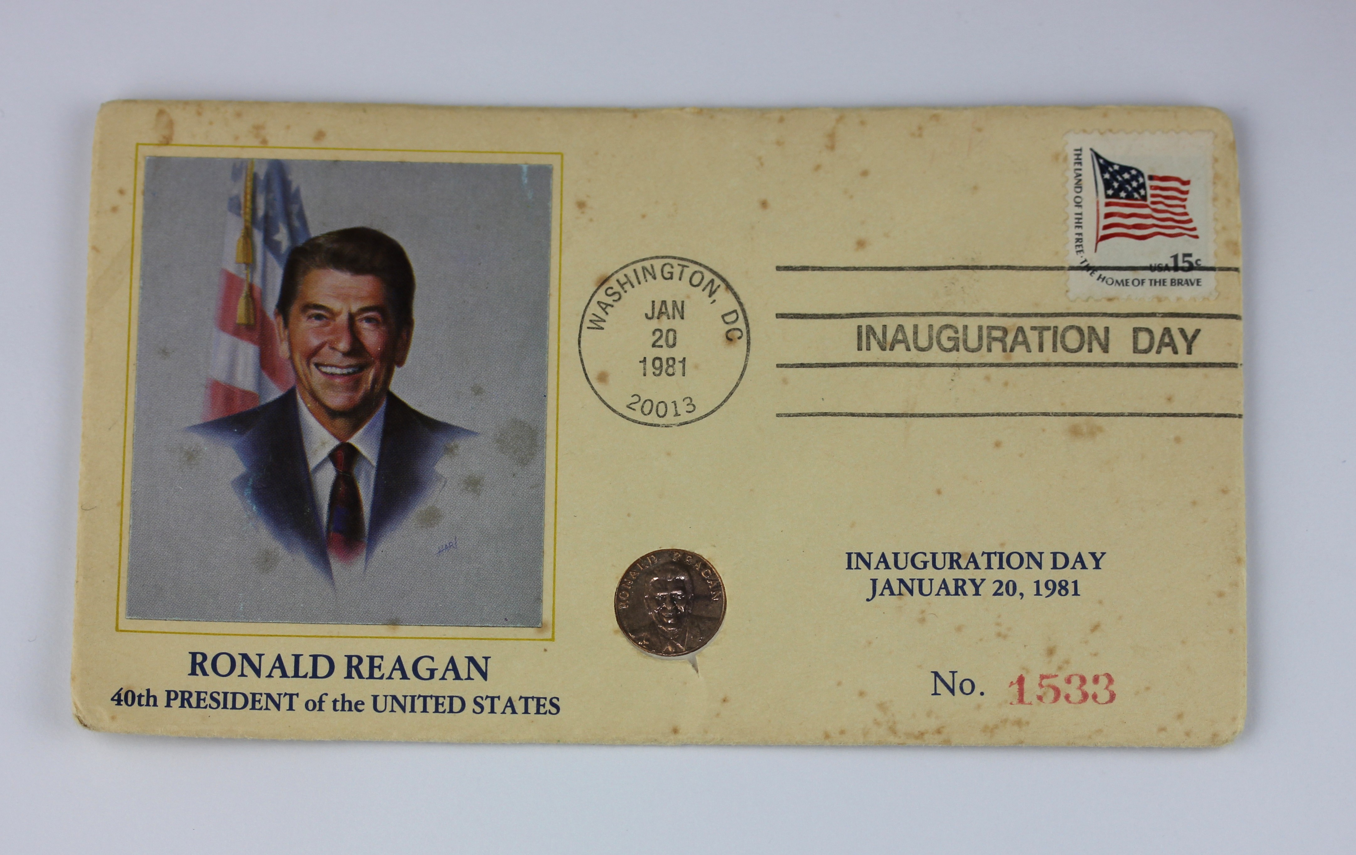A USA Postal Cover comemmorating Inauguration Day January 20 1981 of Ronald Reagan 40th President of the United States, mounted with a 10 KT gold medallion detailed 'The Historic Providence Mint Ronald Reagan'