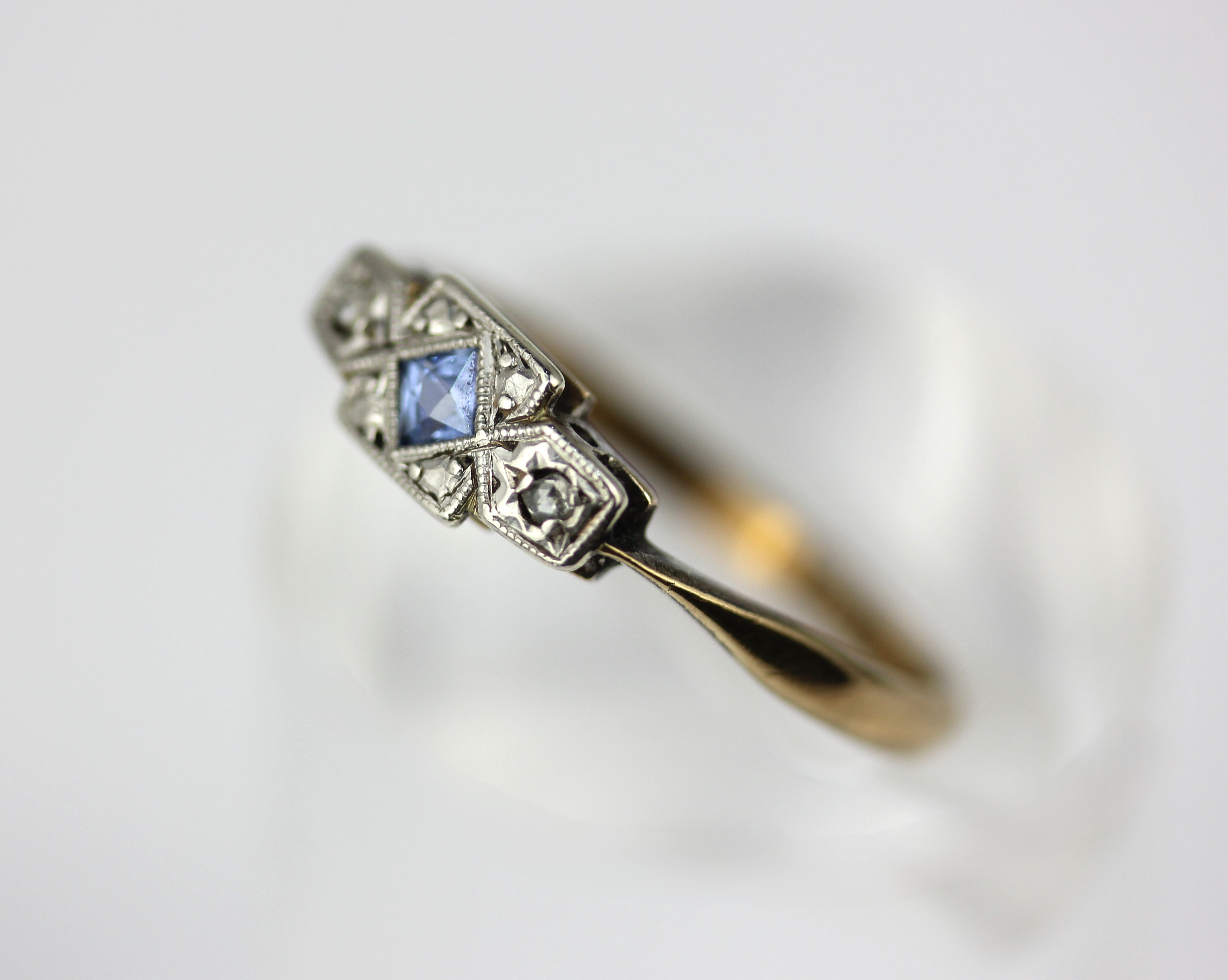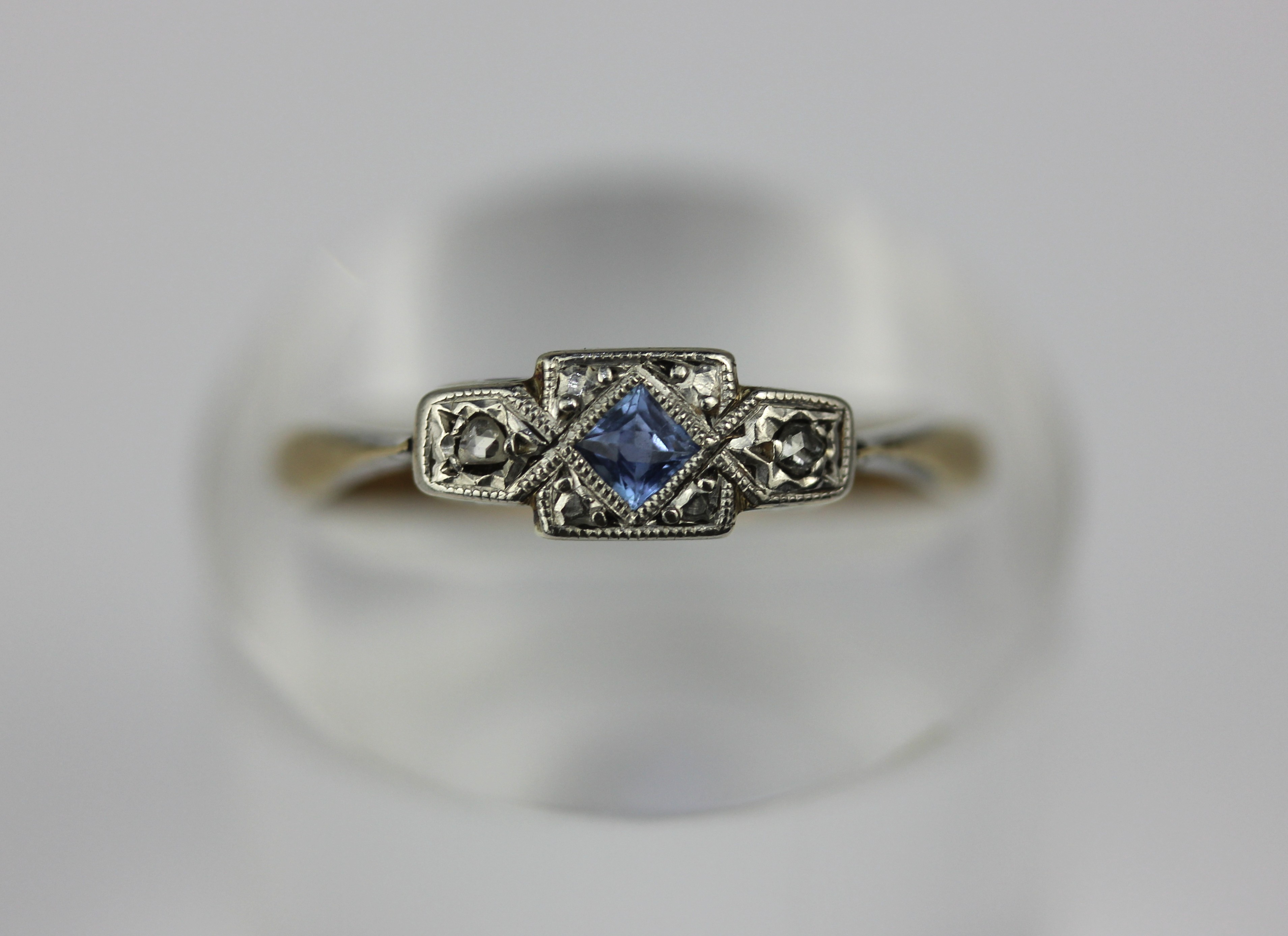 A gold and platinum, sapphire and rose diamond three stone ring mounted with a square cut pale blue sapphire between rose cut diamonds detailed 9ct & plate, ring size N and a half gross weight 1.5g