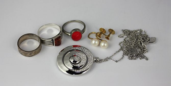Three silver rings a pair of gold and cultured pearl earrings, the screw fittings detailed 9 CT and a Swarovski crystal circular pendant necklace, with two cases and one box
