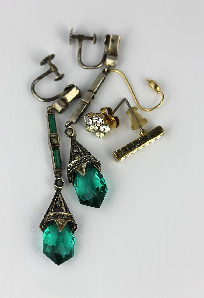 A pair of green paste and marcasite earrings with screw fittings, one opal earring and two costume earrings