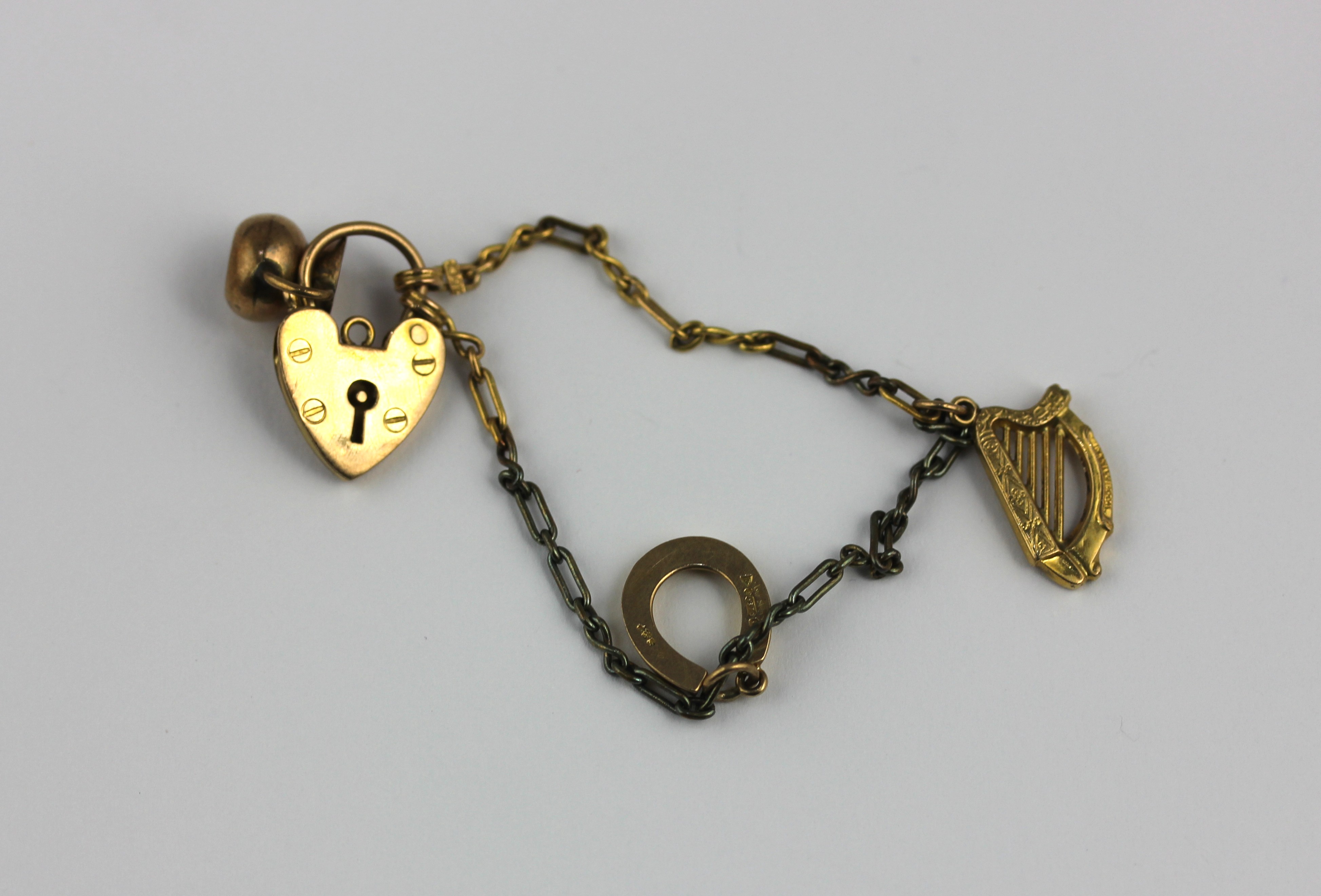 A two colour chain link charm bracelet fitted with three 9ct gold charms comprising a horseshoe, a jug and a harp, with a gold heart-shaped clasp detailed 9ct, gross weight 5.8 gms
