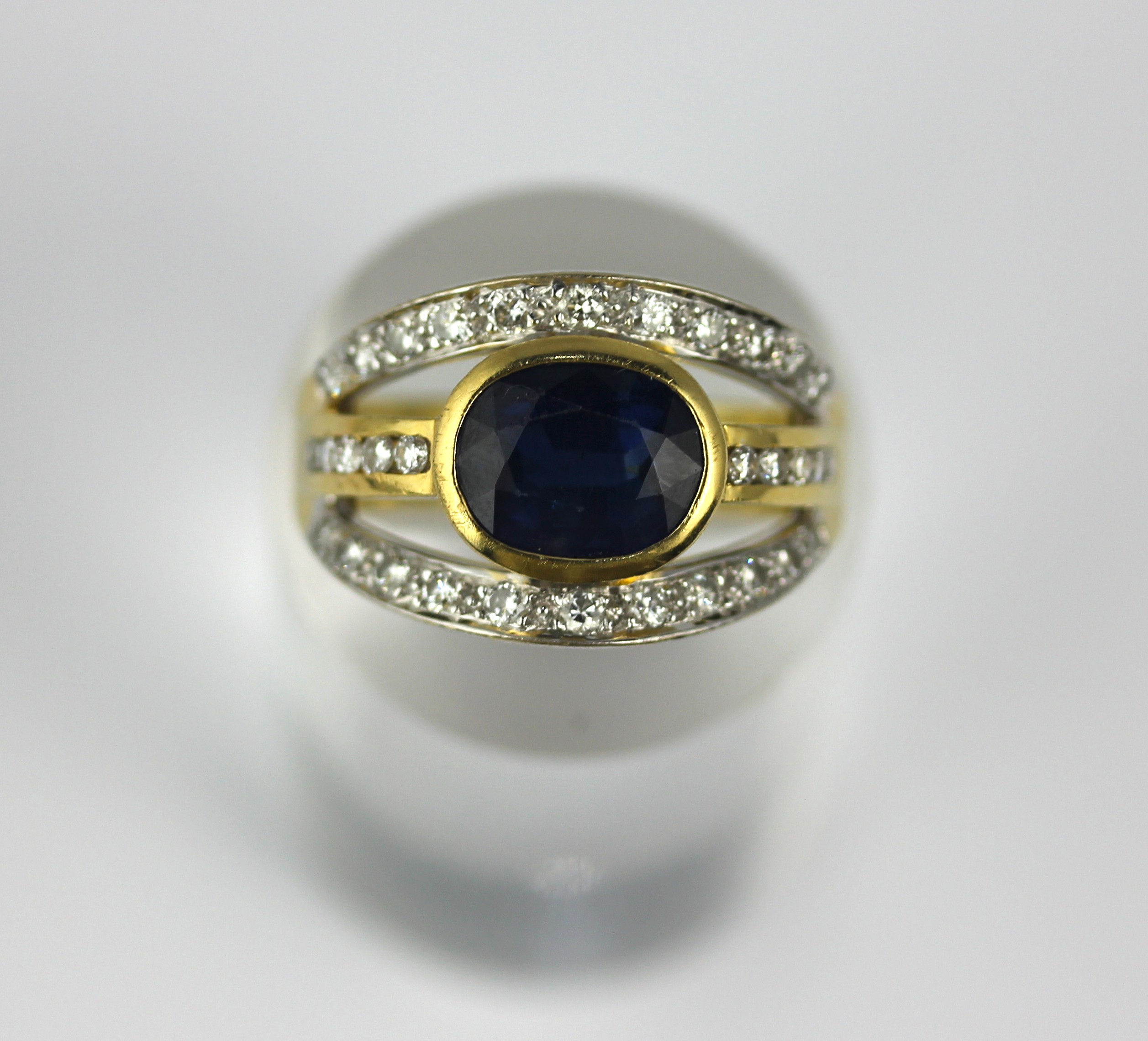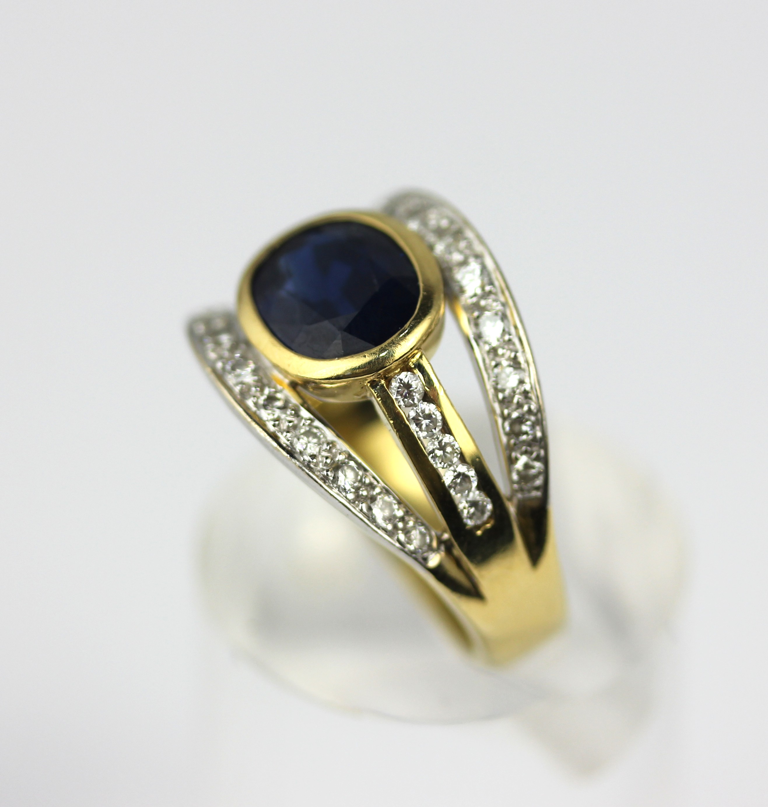 A gold, sapphire and diamond ring collet set with the Oval cut sapphire at the centre between diamond set shoulders and curved sides in an open work design detailed 750 size P and 1/2 gross weight 11.6g
