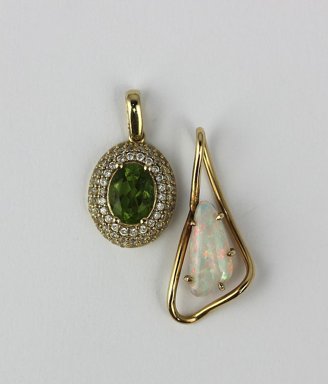 A gold and opal single stone pendant detailed to the suspension loop 14ct and a gold, together with a diamond and pale green gem set oval cluster pendant detailed trend 14k gold combined gross weight 3.4g (2)