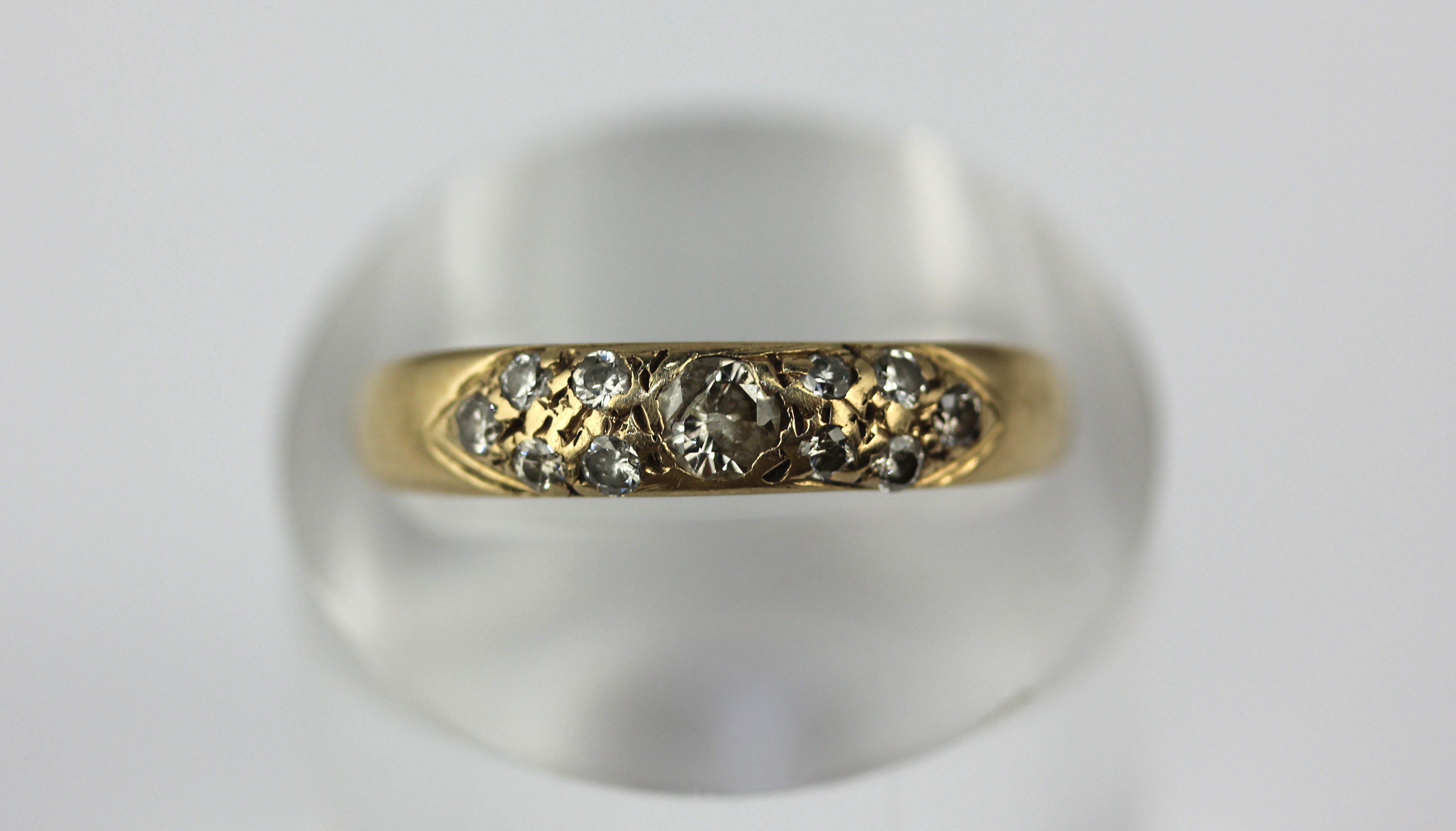 A gold and diamond ring set with the principal circular cut diamond at the centre, detailed '9ct', size K 1/2, gross weight 2.7g