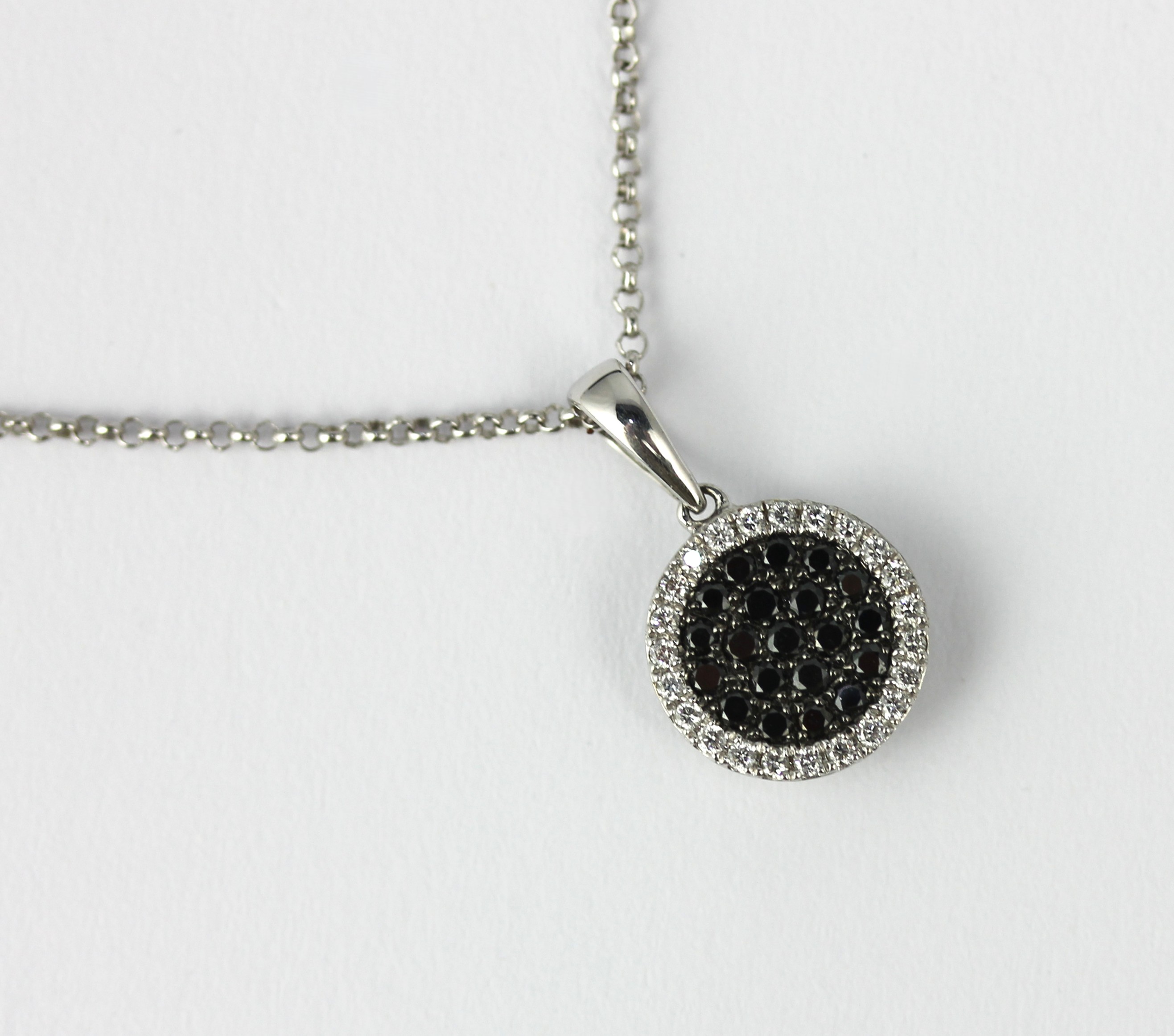 A white gold black and colourless diamond circular cluster pendant detailed 18k 750 with an 18ct white gold neck chain on a bolt ring clasp chain length 45cm gross weight 2.6g