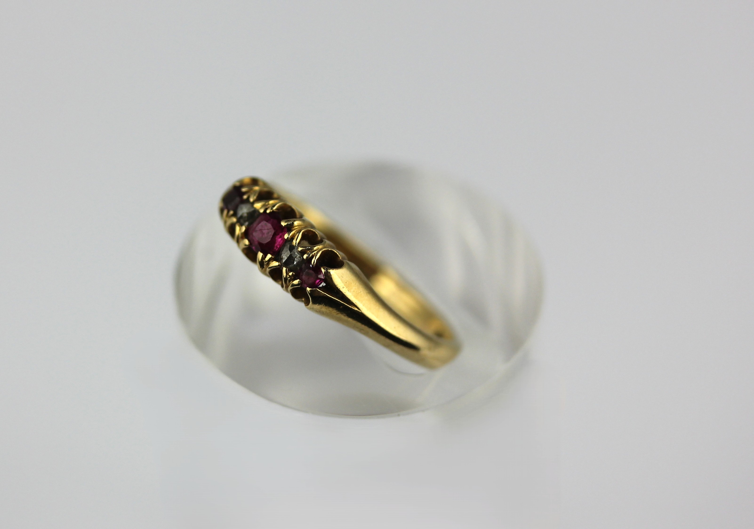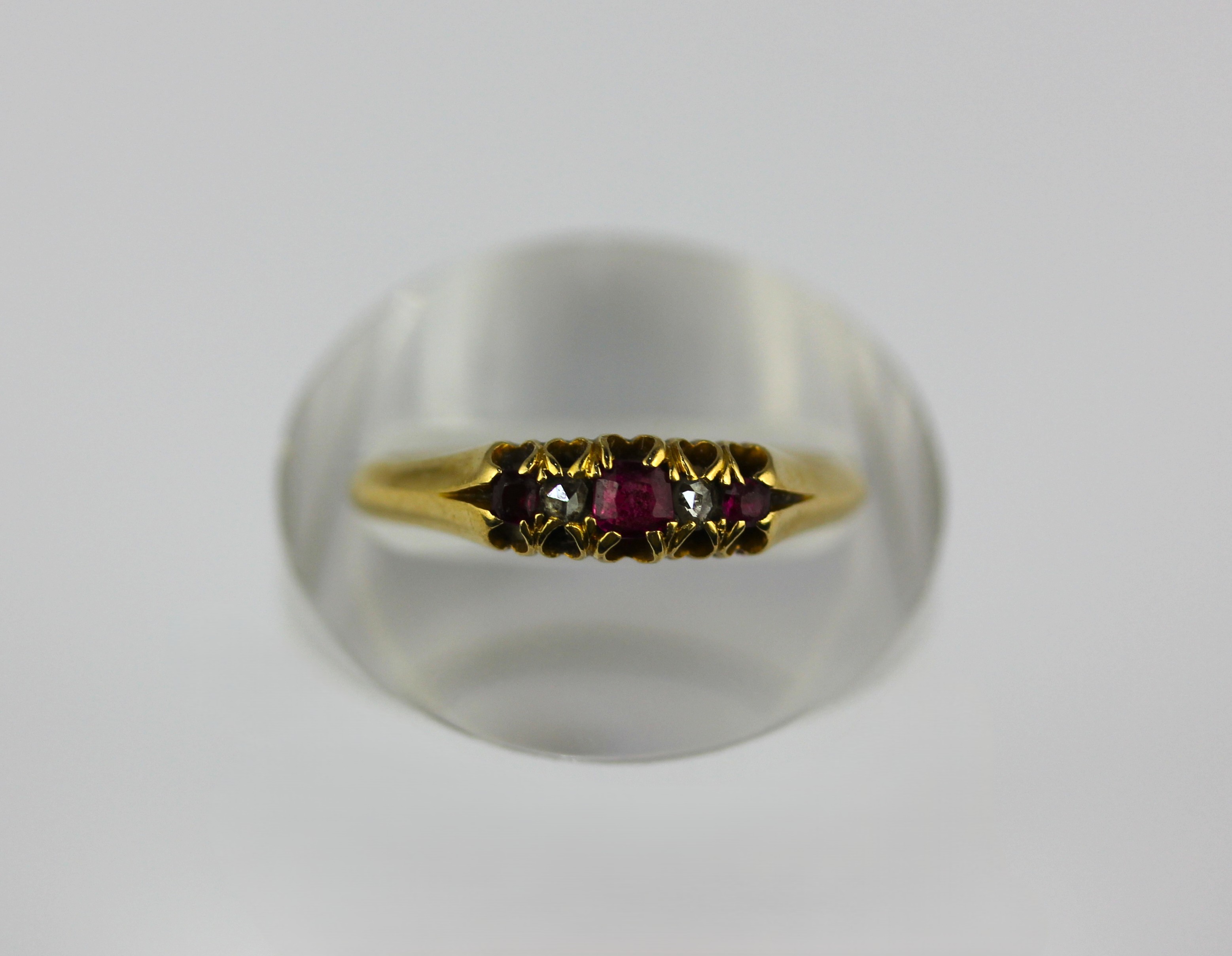 A gold, ruby and diamond five stone ring set with three rubies and with two diamonds, detailed '18CT', gross weight 3g, with a case